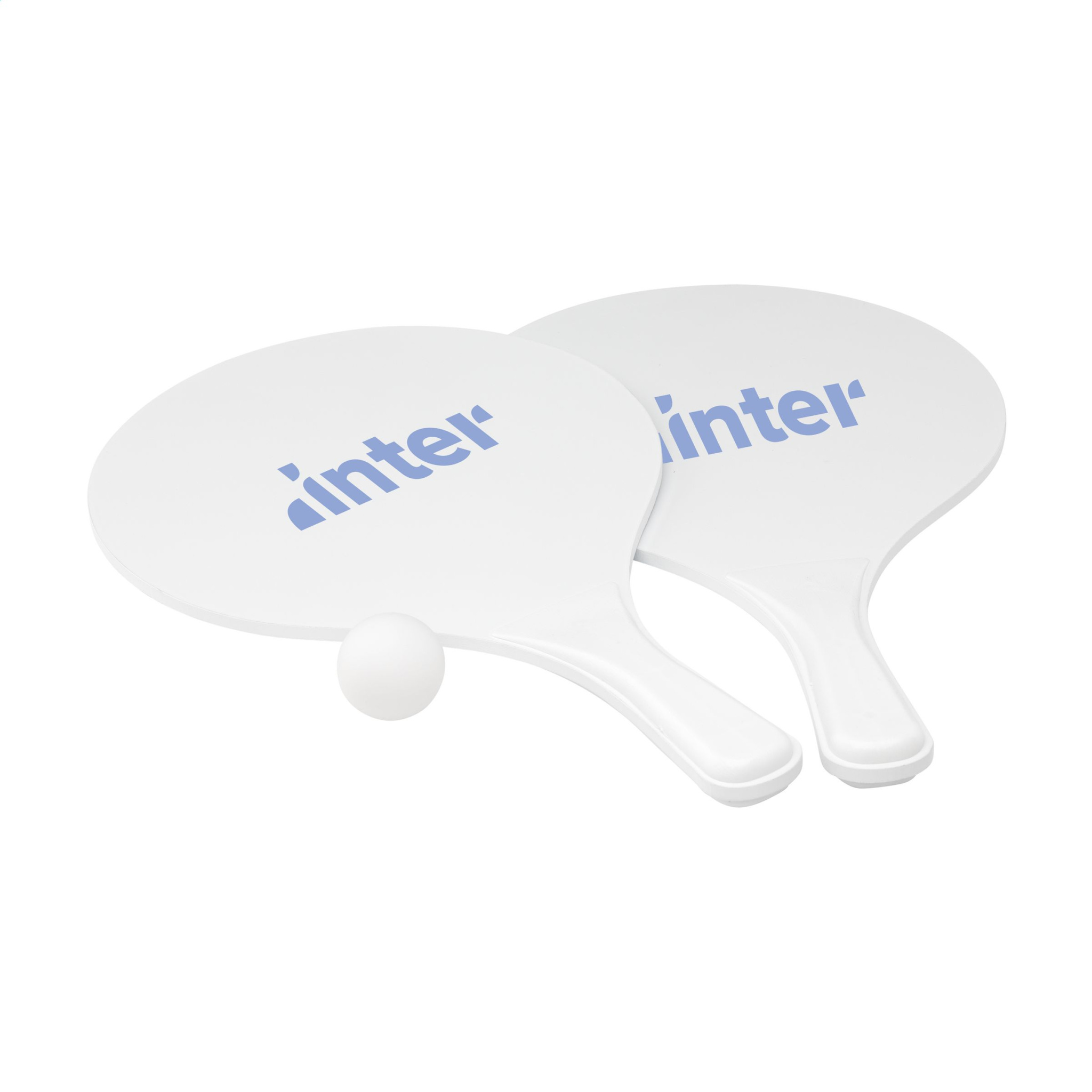 Sportliches Strandset: 2 Schläger aus MDF-Holz mit PP-Kunststoffgriffen und Gummiball. Jedes Set wird in einem Aufbewahrungsnetz geliefert.