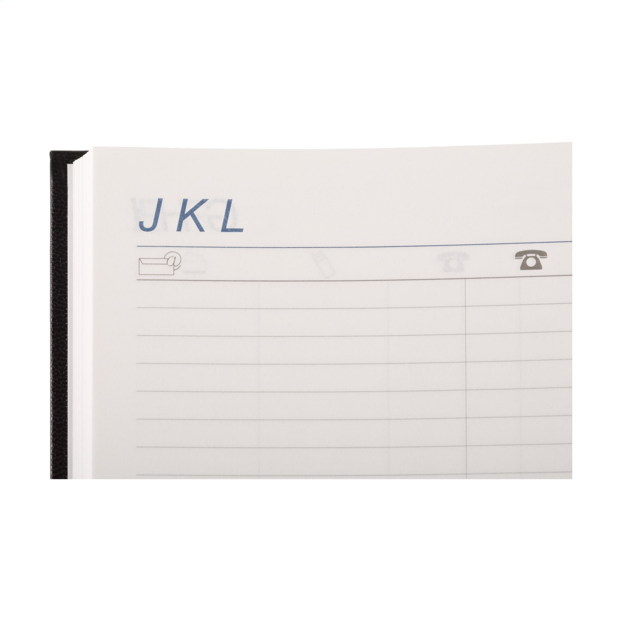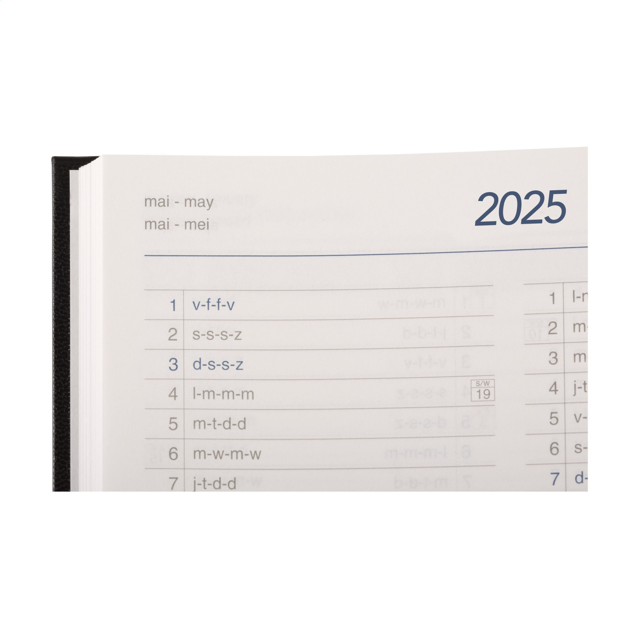 Viersprachiger Bürokalender: EN, NL, F und D. Mit strapazierfähigem, gepolstertem Balacron-Umschlag und Jahresprägung auf der Vorderseite. 80 g weißes, FSC Mix-zertifiziertes Papier, große Wochenübersicht über zwei Seiten, 2-farbiger Druck, Fadenheftung, Wochenübersicht auf zwei Seiten, Jahresplaner aktuelles und nächstes Jahr, zusätzliche nützliche Informationen. Nahezu A5-Format.