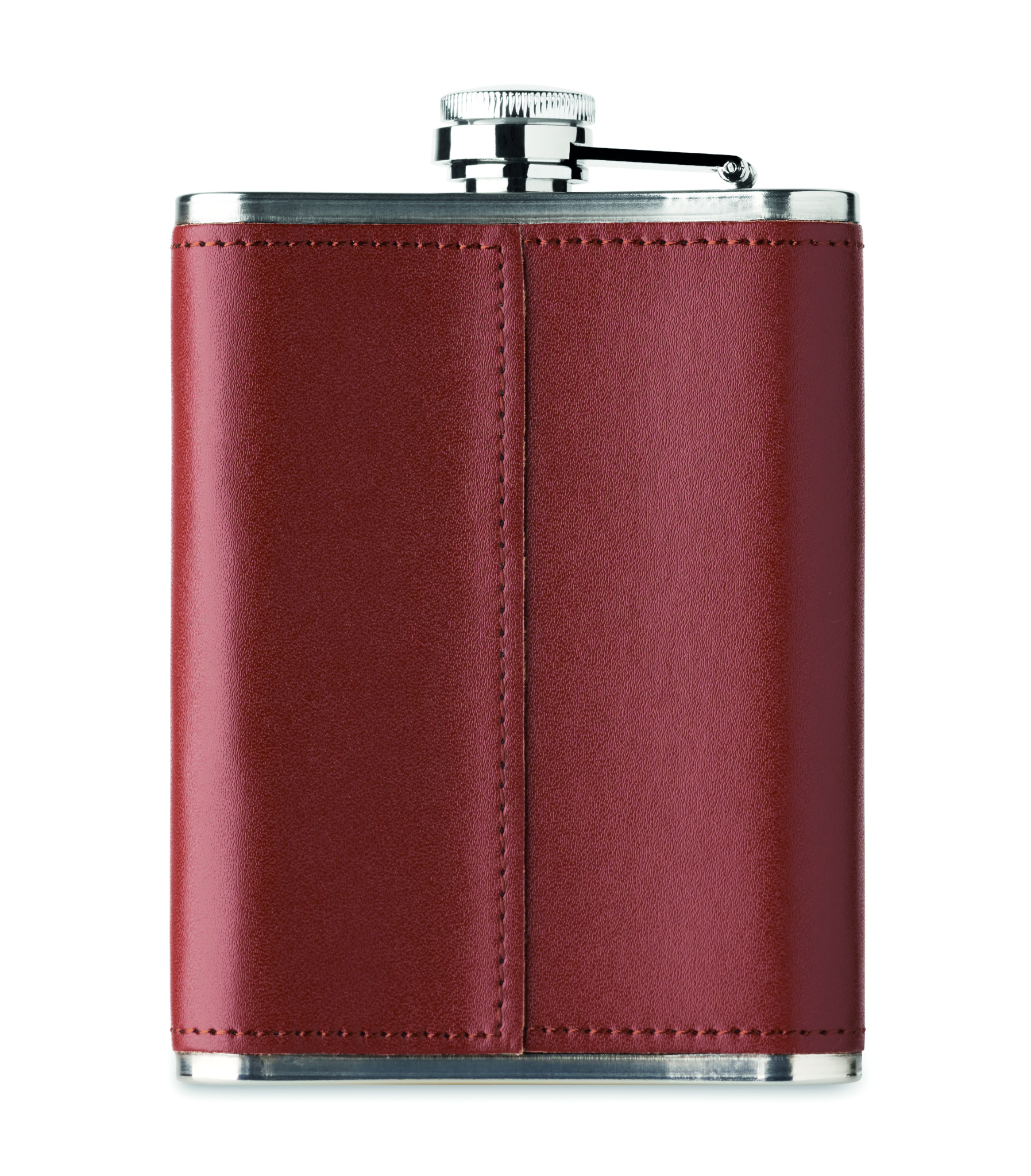 Flachmann aus Edelstahl mit PU-Hülle. Füllmenge: 200 ml.