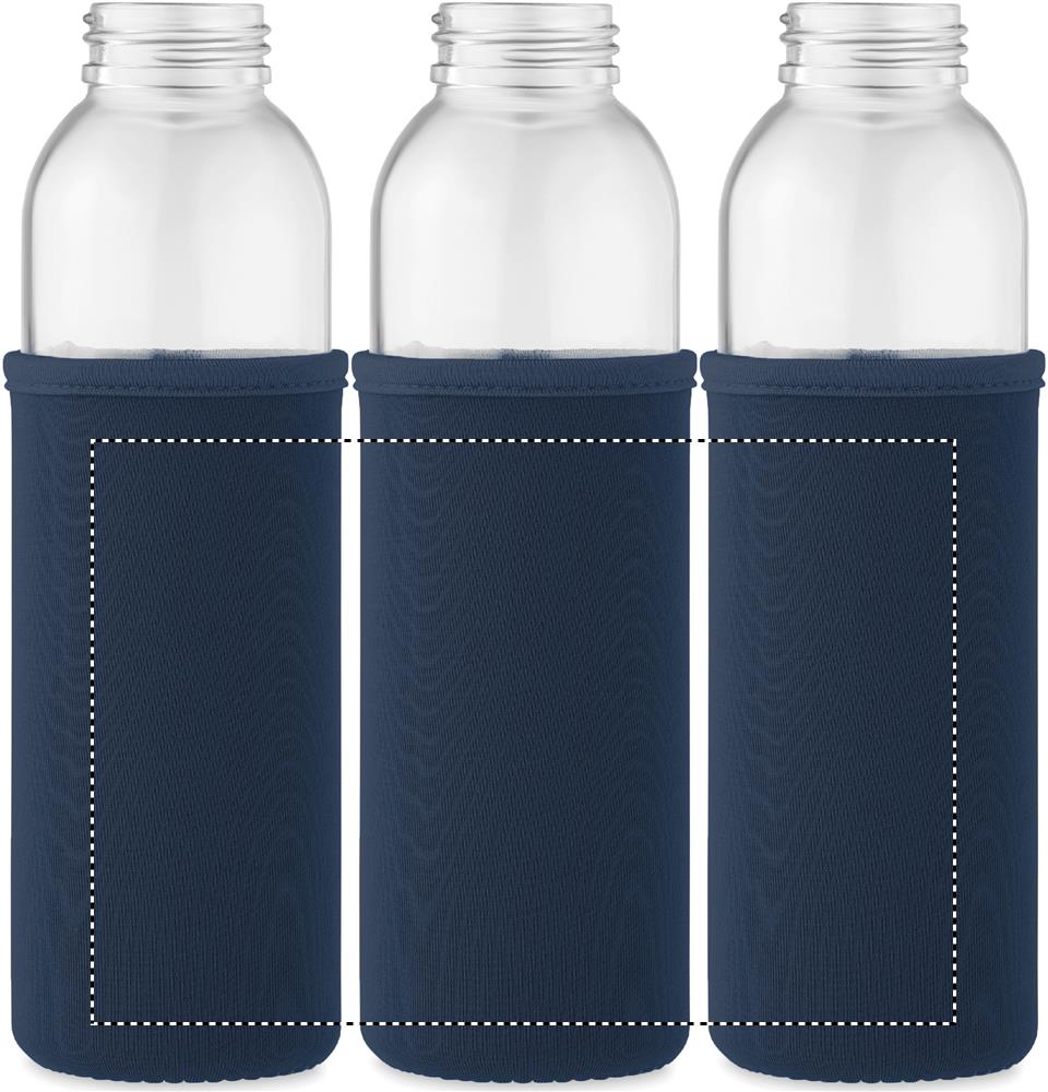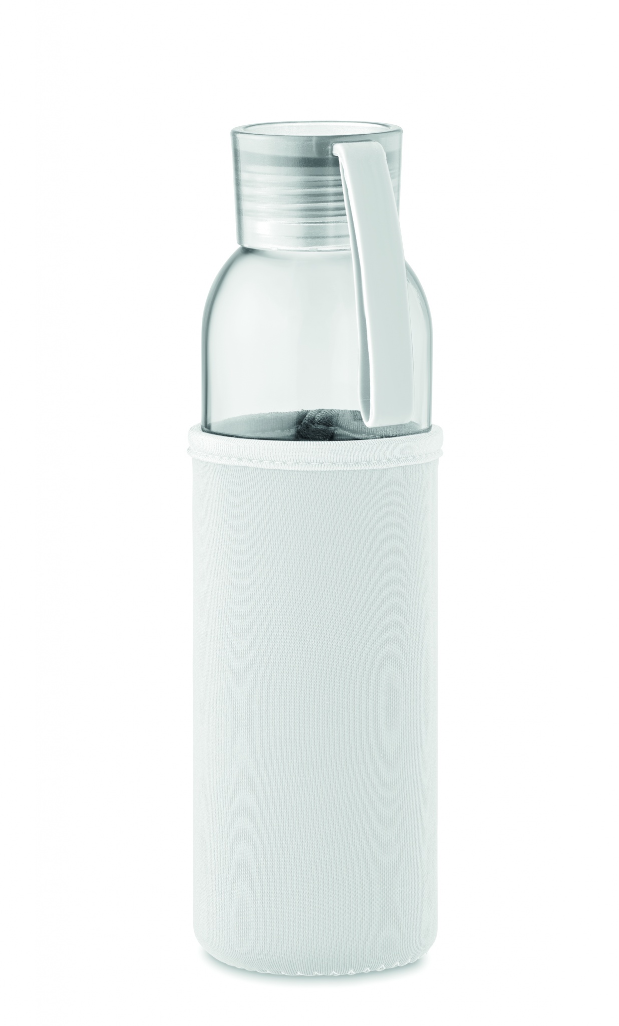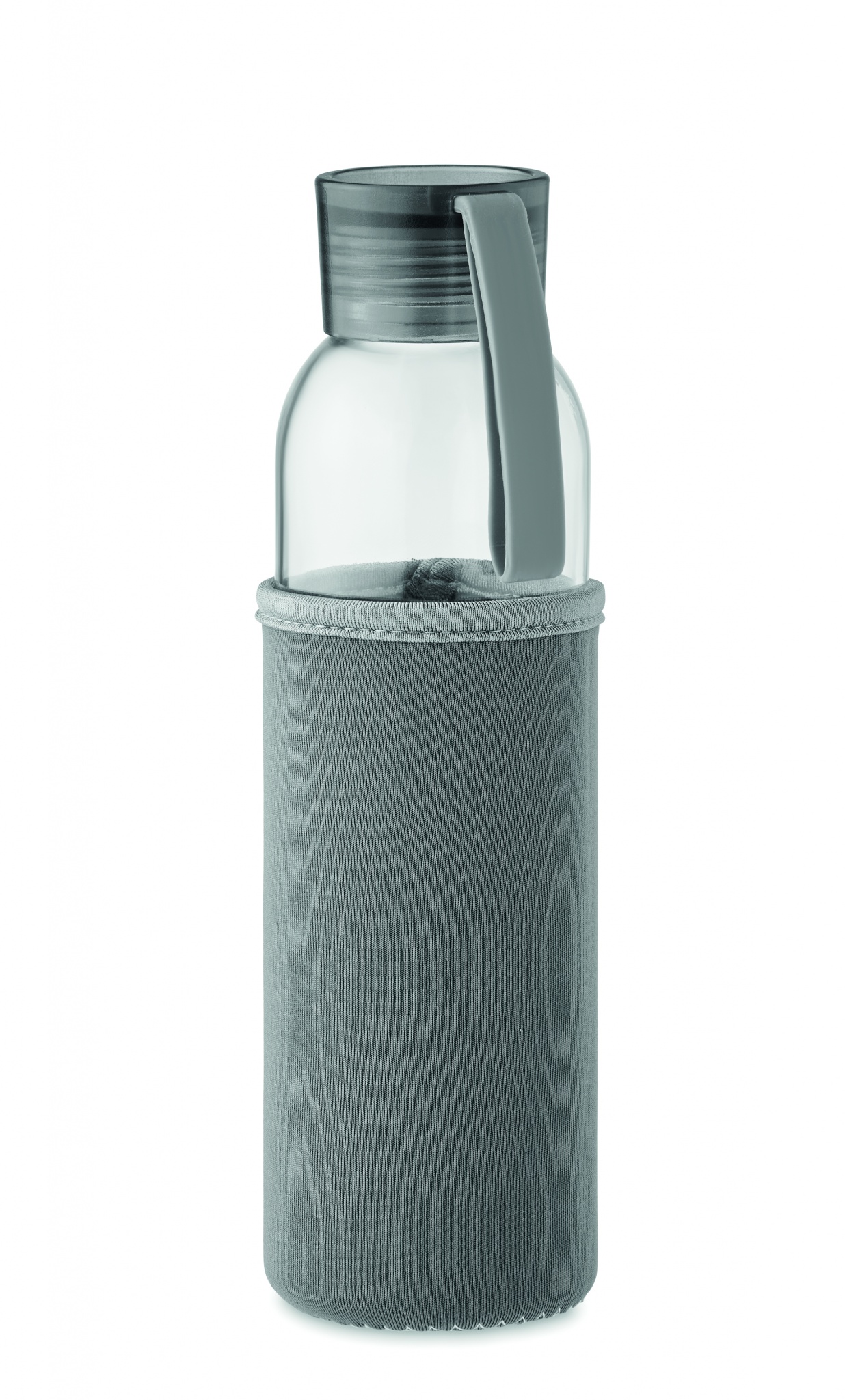 Trinkflasche aus recyceltem Glas mit Neopren-Schutzhülle und PP-Deckel mit Silikon-Schlaufe. Auslaufsicher. Füllmenge: 500 ml.