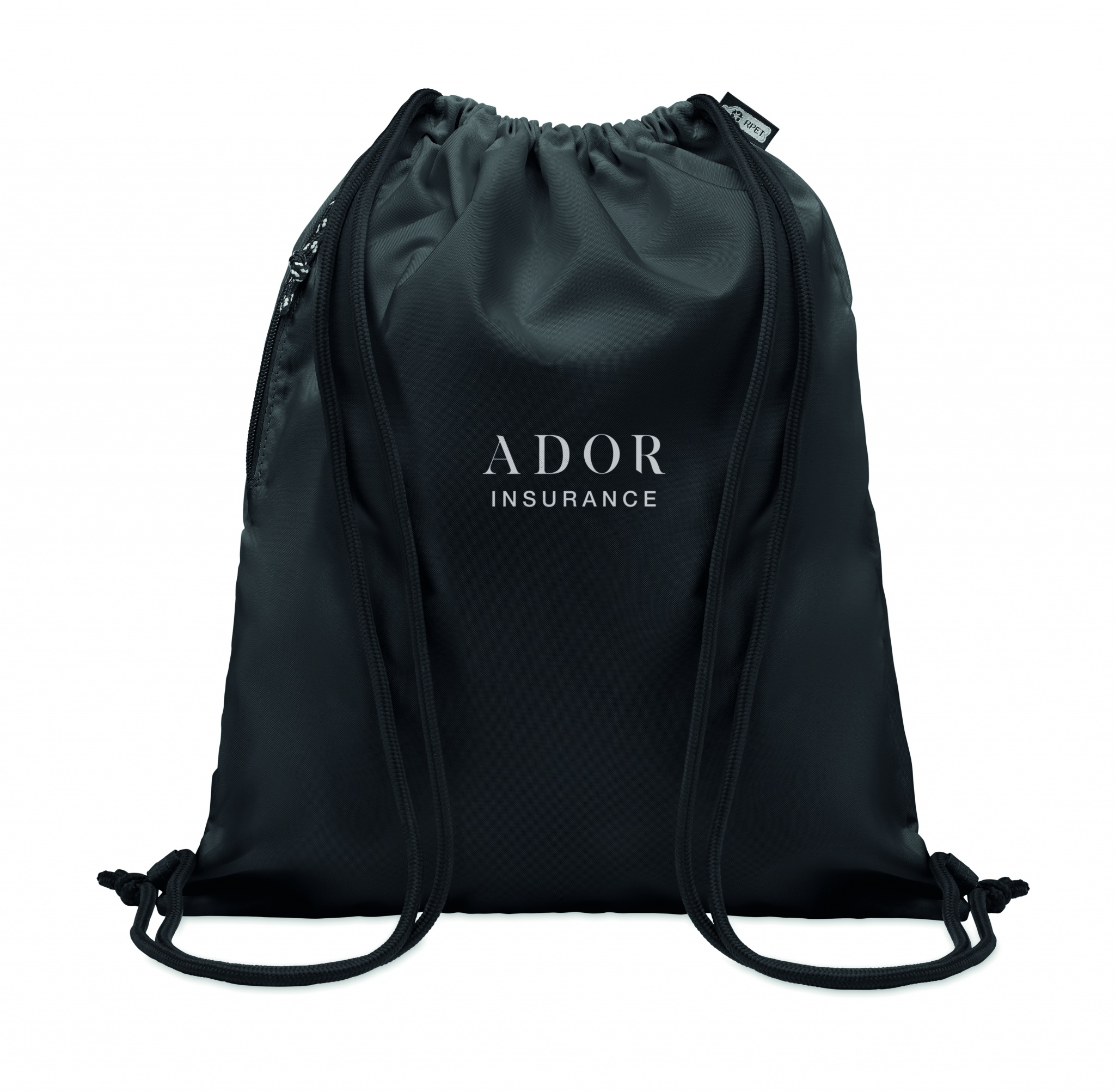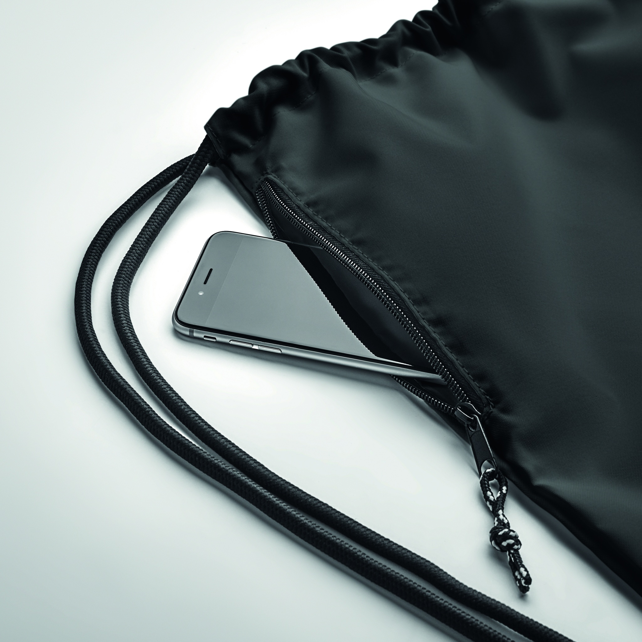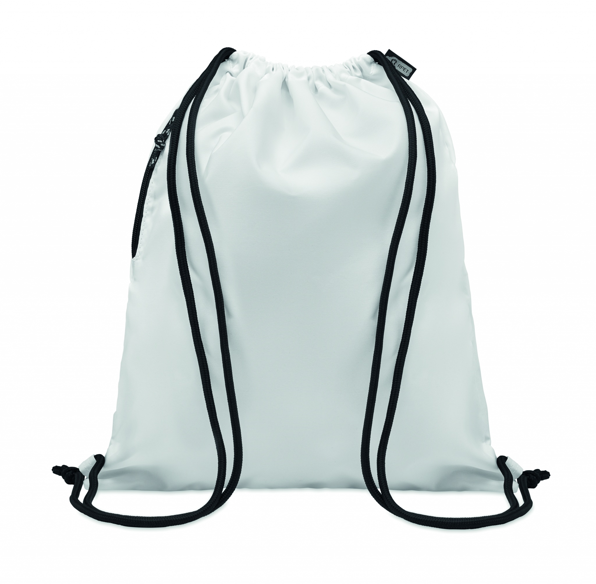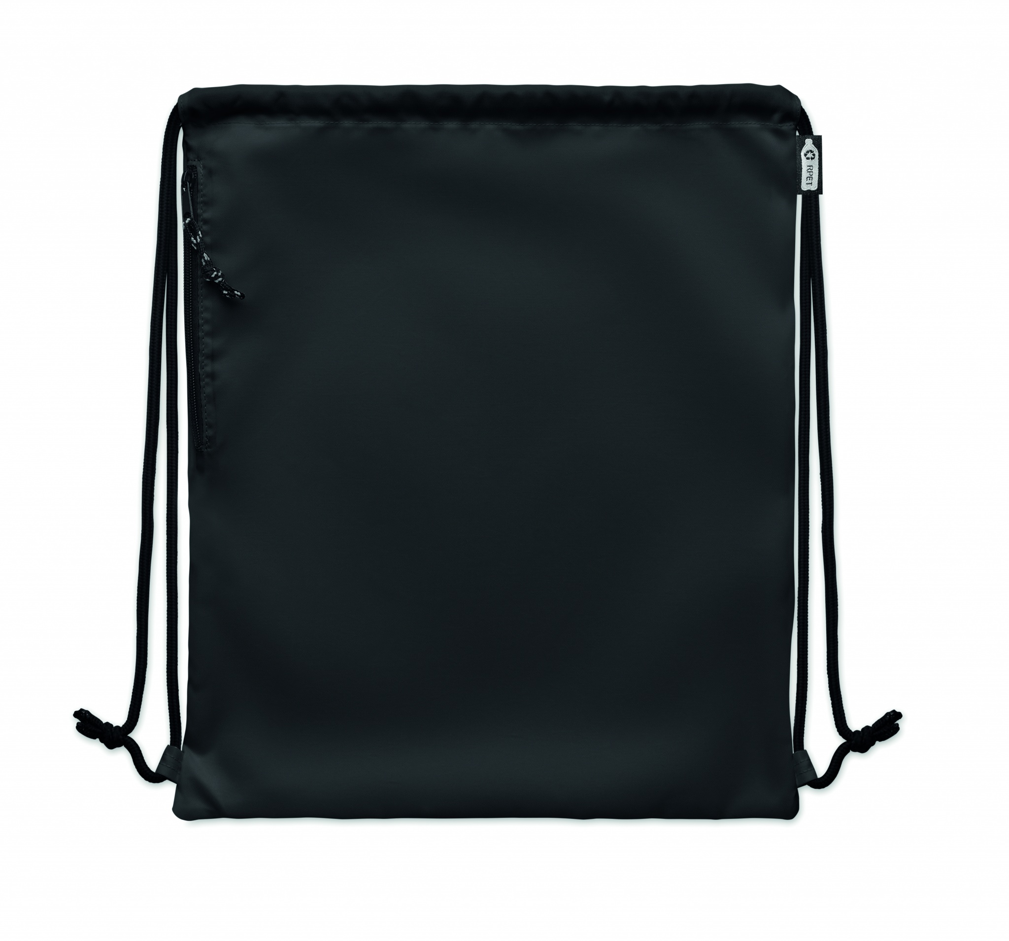 Großer Beutel mit Kordelzug. Seitliche Reißverschlusstasche. 300D RPET-Polyester