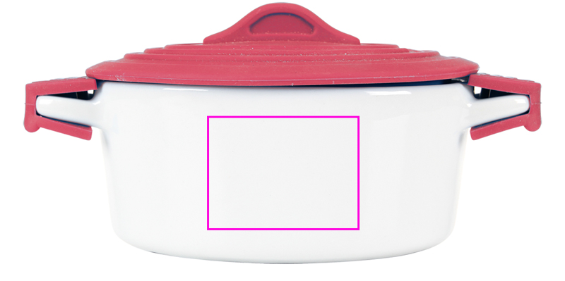 Topf aus Porzellan (spülmaschinen-, backofen- und mikrowellengeeignet), mit hitzebeständigen Silikongriffen (bis 250 °C). Ihre Werbung wird im Keramiktransferverfahren auf den Topf gedruckt.