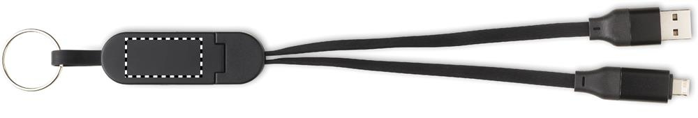 Schlüsselring mit Smartphone-Halter und 60W-Kabel. Gehäuse aus recyceltem ABS. Eingang: 2-in-1 Typ C und Typ A. Ausgang: Typ C und Mikro-B (2-in-1-Pin). Kabellänge: 26 cm.