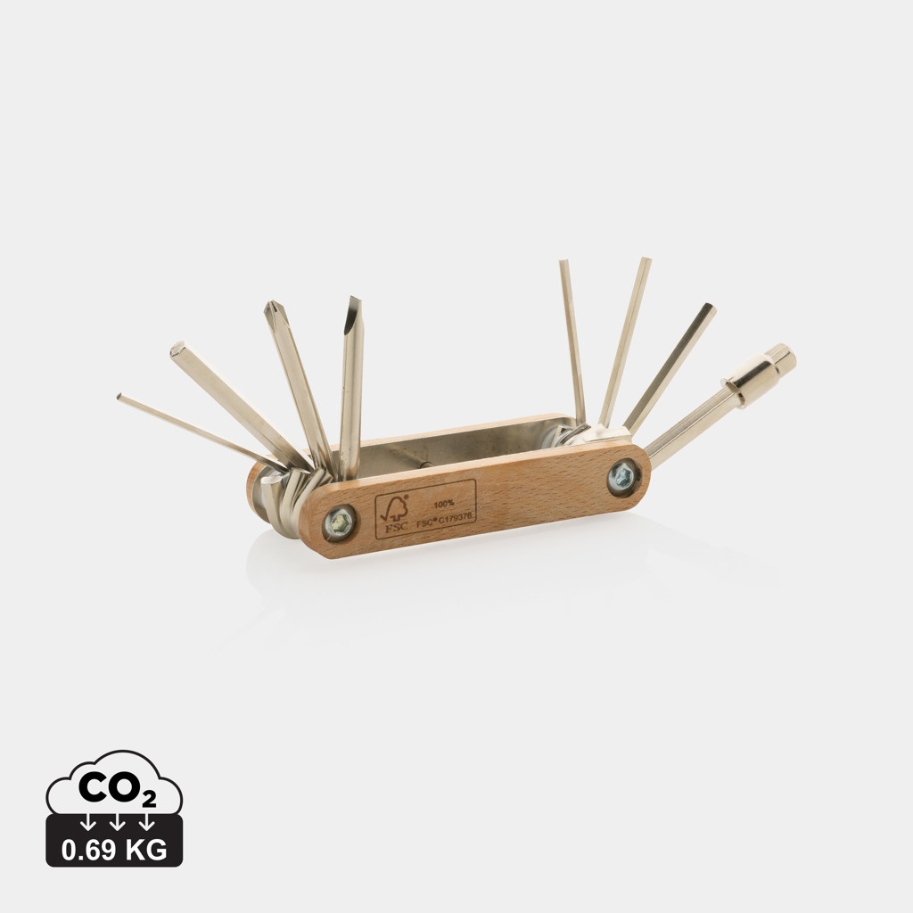 Sechskantwerkzeug aus 100% FSC-Buchenholz und hochfestem und korrosionsbeständigem Karbonstahl (Nr. 45). Rockwell-Härte 40-45. Der Artikel hat 9 Funktionen: Innensechskantschlüssel 2mm / 2,5mm / 3mm / 4mm / 5mm / 5,5mm sowie einen Kreuzschraubendreher und einen Schlitzschraubendreher. Grifflänge 9,3 cm; Griffstärke 3,2 cm. Verpackt in FSC-Mix-Kraftkarton.