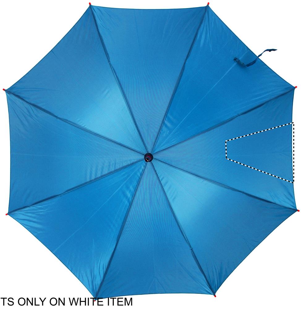 23 inch auto open umbrella in 190T polyester with wooden shaft, tips and top. Black plated metal ribs. Curved natural finish wooden handle.