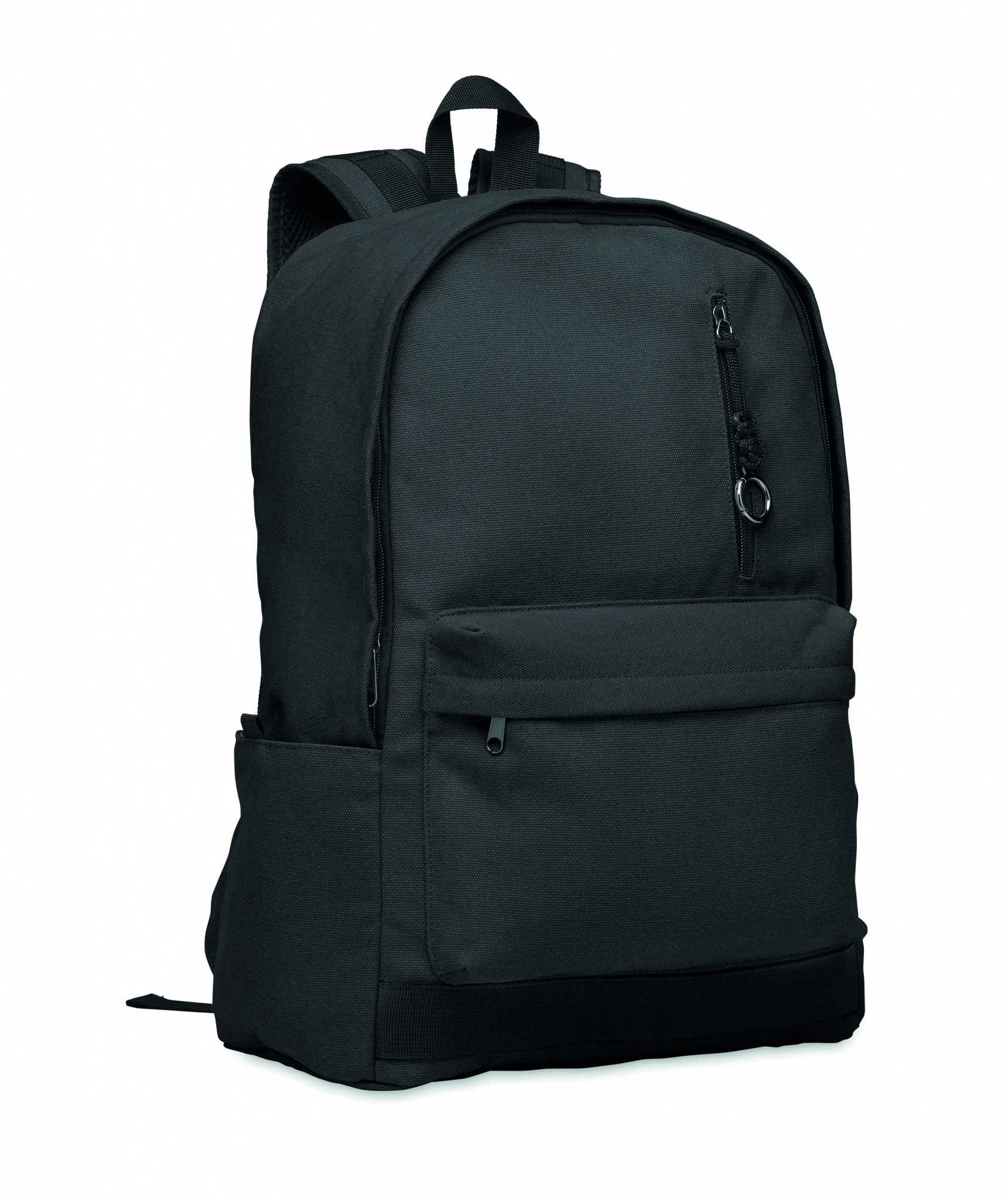 A 15-inch laptop backpack made of recycled pre-consumer cotton with customizable printing, Black