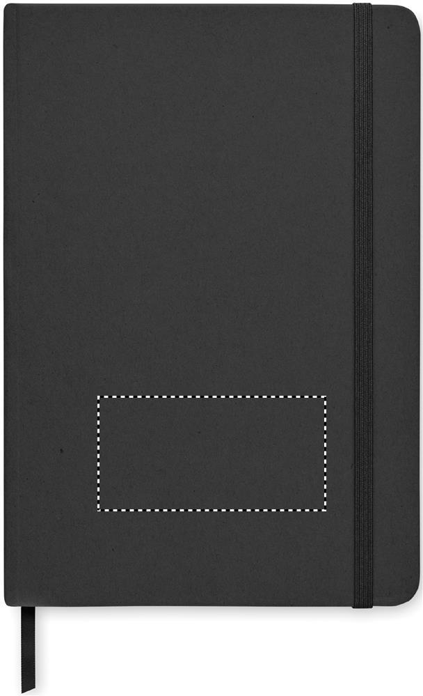 A5 notebook with hard recycled carton cover. Casebound. 160 stone paper lined pages (80 sheets). Elastic closure strap and ribbon page-marker.