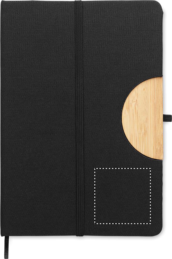 A5 notebook with 600D RPET hard cover with bamboo detail with a smartphone stand function. Casebound. 160 lined pages (80 sheets). 70 gsm recycled paper. Matching elastic closure strap, ribbon page-marker and pen holder. Bamboo is a natural product, there may be slight variations in colour and size per item, which can affect the final decoration outcome.
