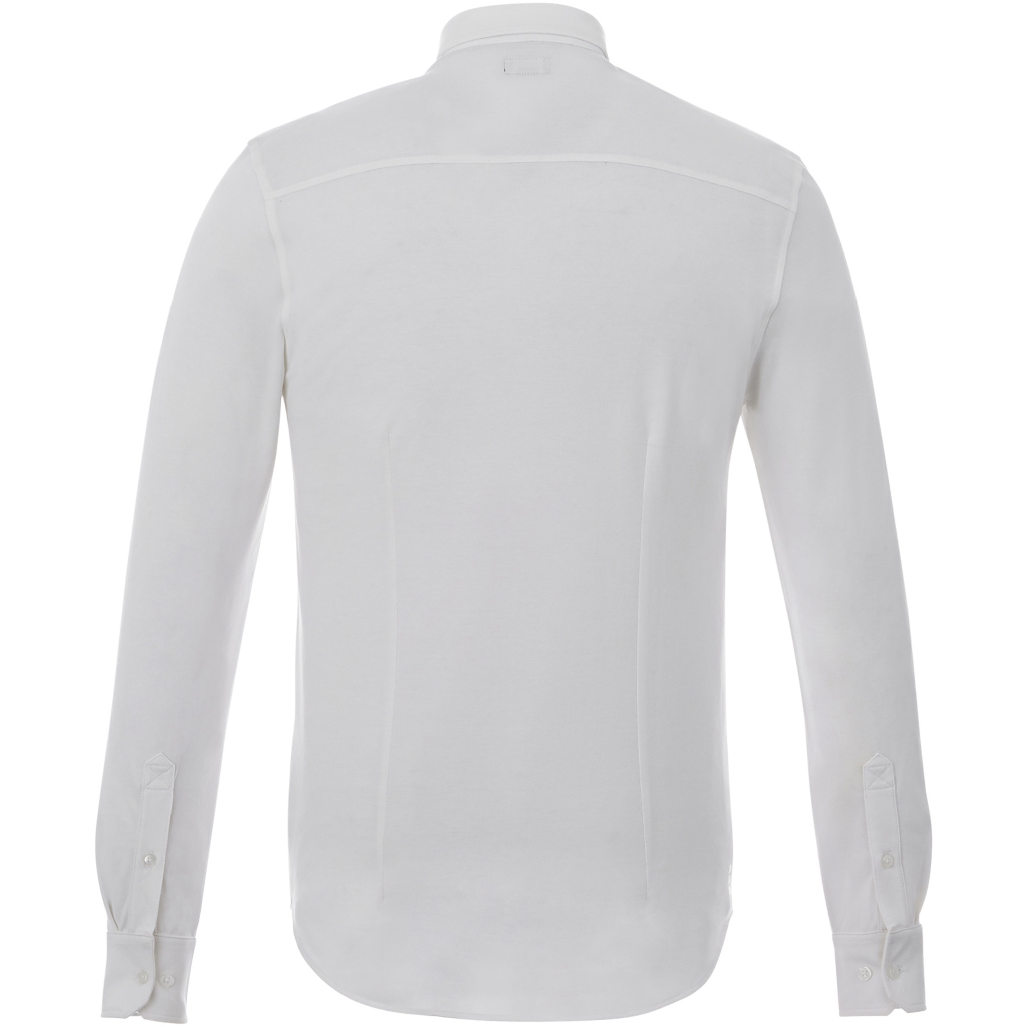 Self fabric collar. Stretch fabric. Adjustable cuff with single pleat. Button-down collar. Satin piping at inside neck. Dyed-to-match engraved buttons. Woven main label.