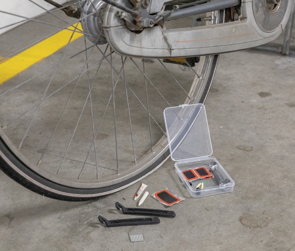 Compact easy to carry bike repair kit easy to carry in a PP box. The set includes 1 aluminum alloy wrench, 2 tyre levers, 1 glue, 2 valve caps, 2 valve tubes, 1 grater, 5 repair patches.