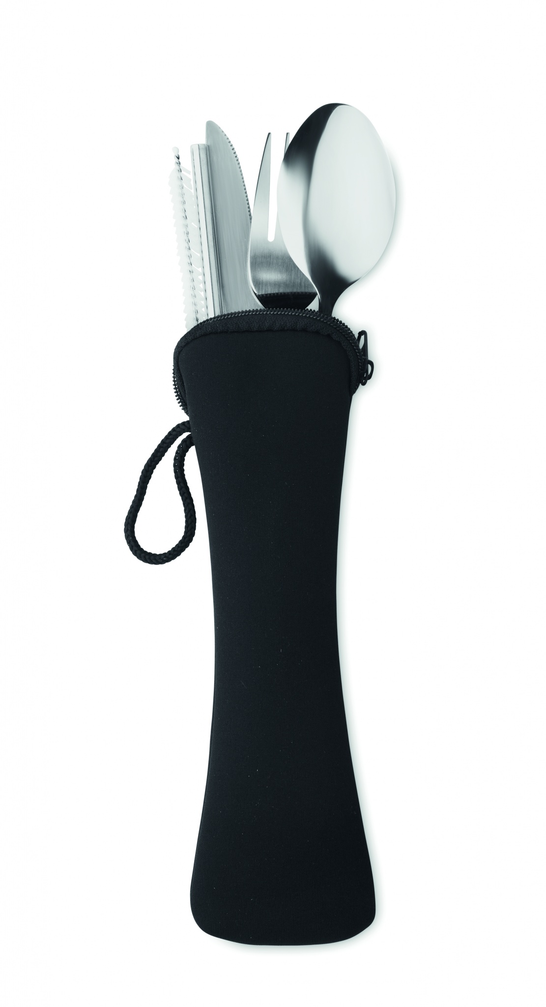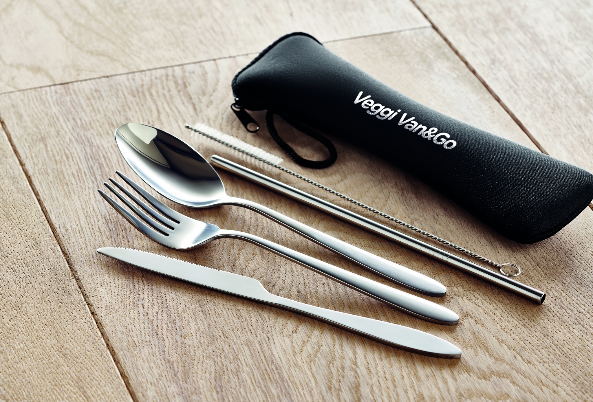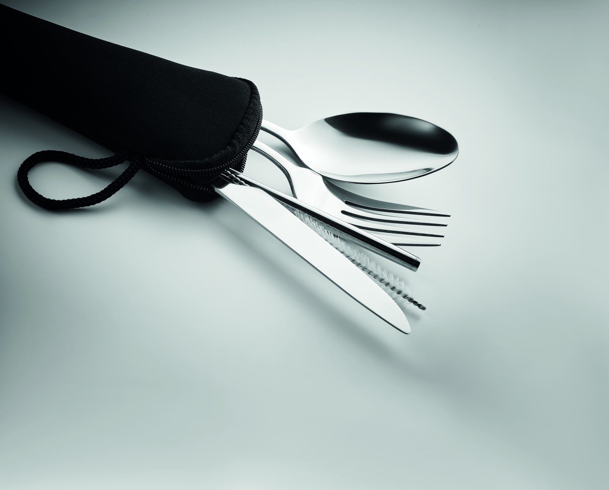 Re-usable stainless steel cutlery set including fork, knife, spoon, straw and brush in neoprene pouch.