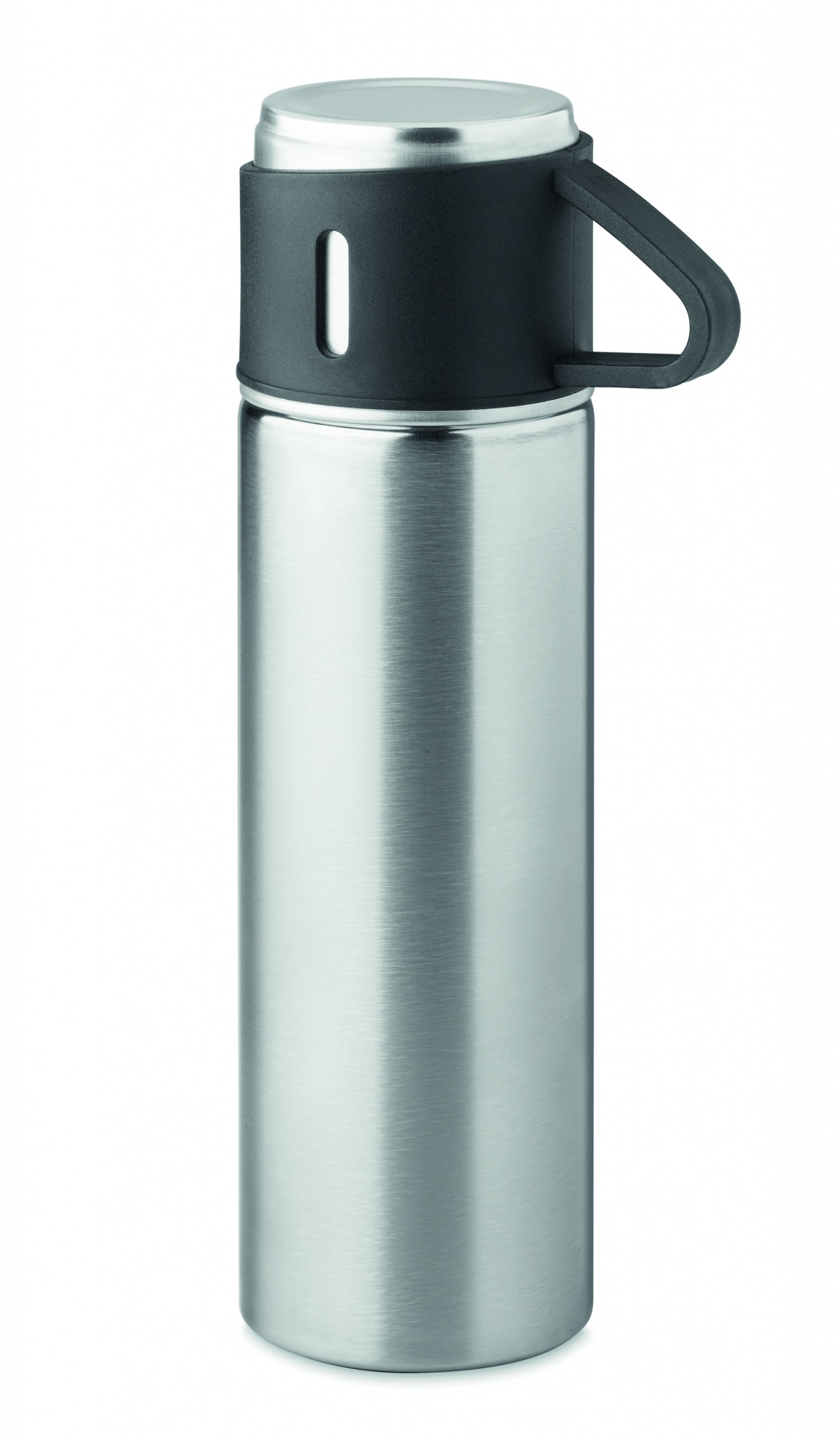 Double wall stainless steel vacuum insulated flask with leak-free cup lid. Capacity: flask 420 ml, cup 150 ml.