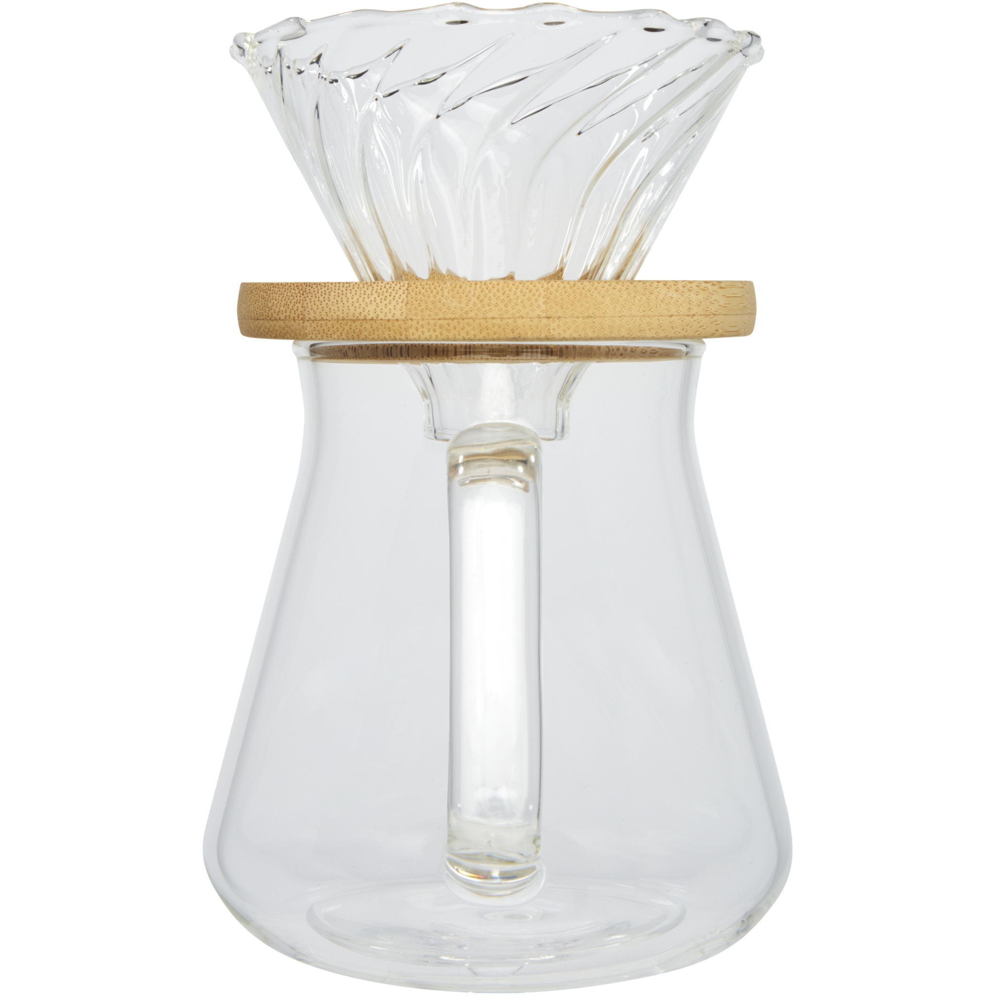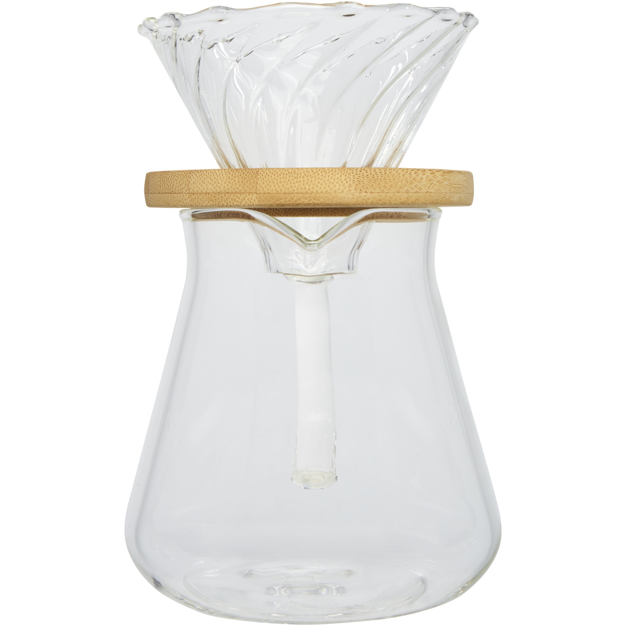 High-temperature-resistant glass espresso coffee maker with a capacity of 500 ml. The filter can be separated. Works with filter paper. The bamboo holder is from sustainable, environmentally, and socially responsible sources.
