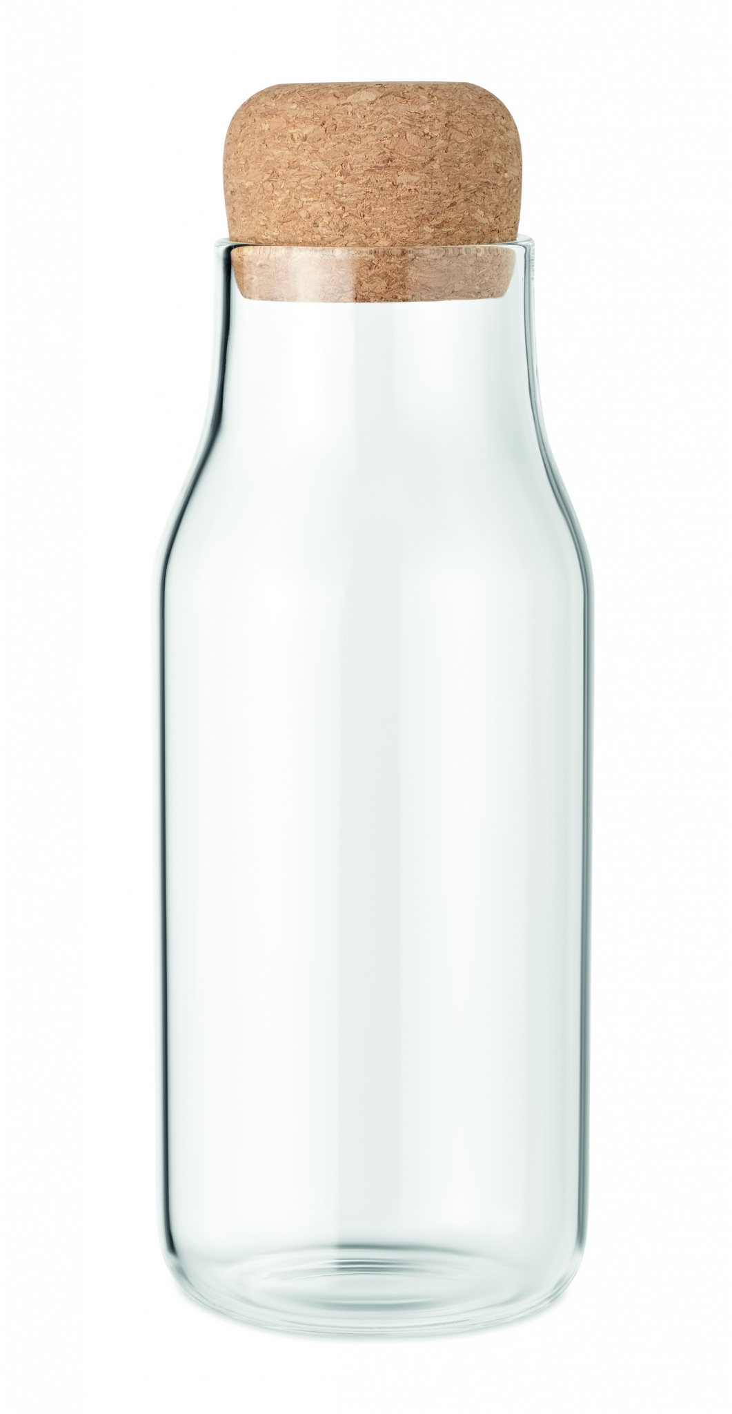 Borosilicate glass bottle with cork lid. Capacity: 600 ml. Cork is 100% natural material. Due to its structural nature and surface porosity the final print result per item may have deviations.