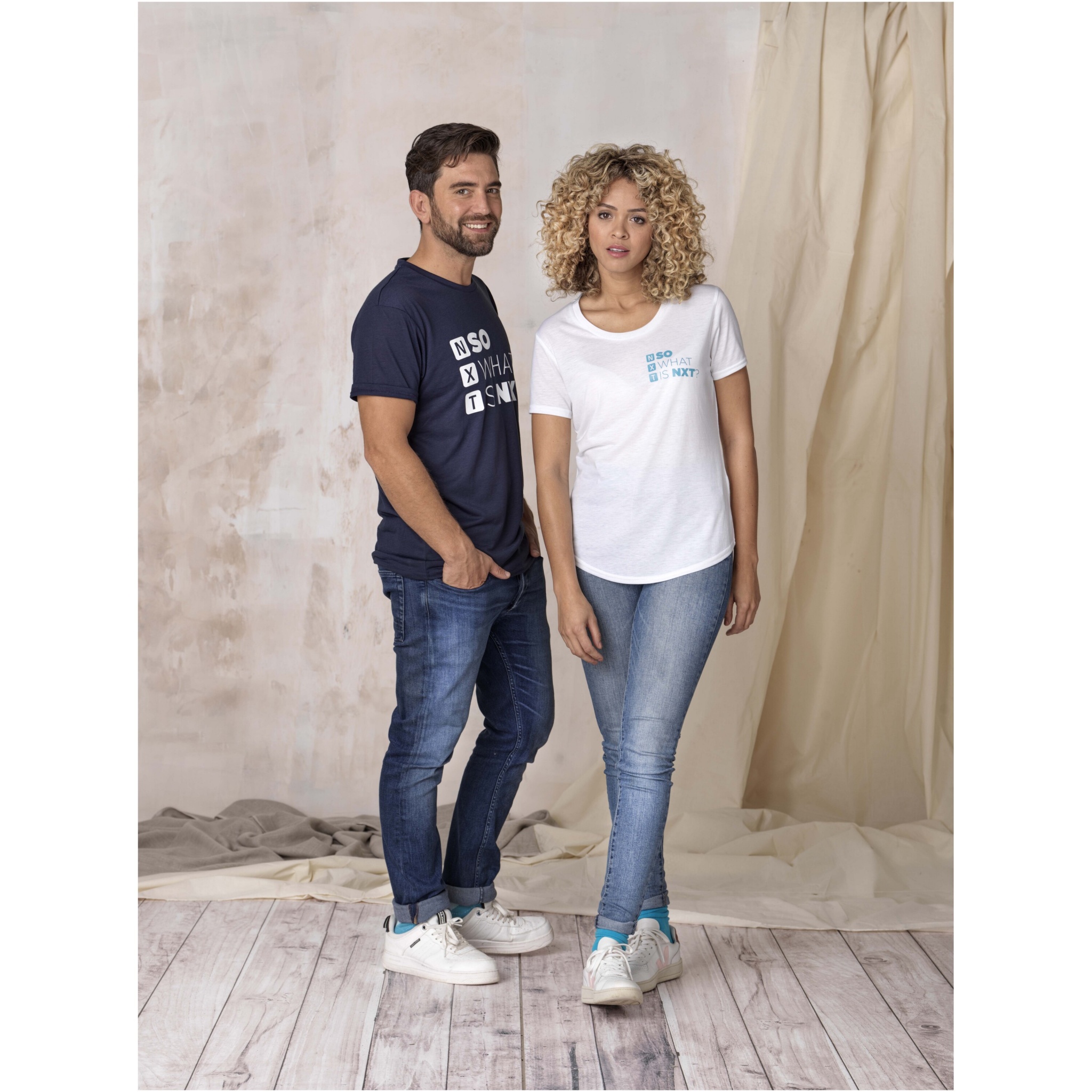 Sustainable promotional apparel. Scoop neck. Side seams. Dropped back hem. Shoulder to shoulder tape. Double needle stitching detail.