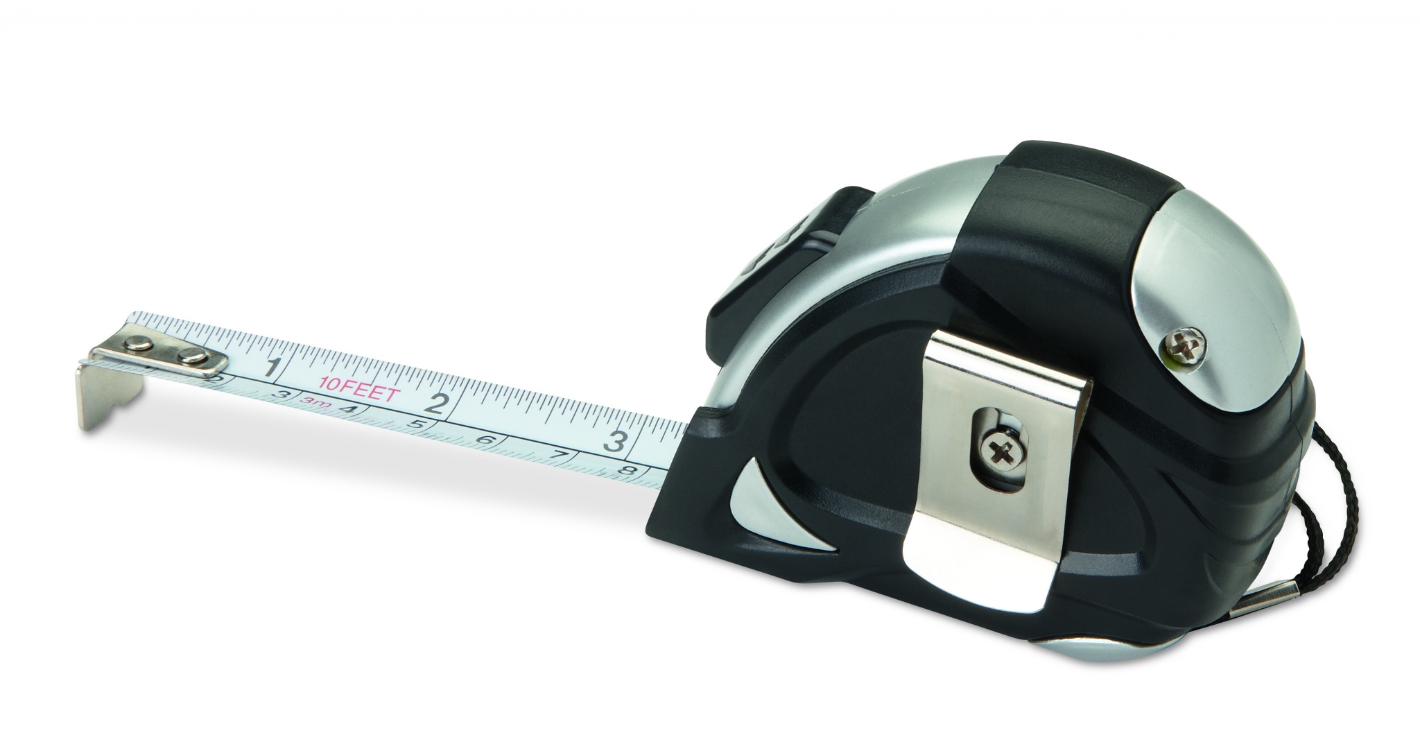 3m ABS measuring tape in silver case. Includes hand strap and shiny silver metal clip.