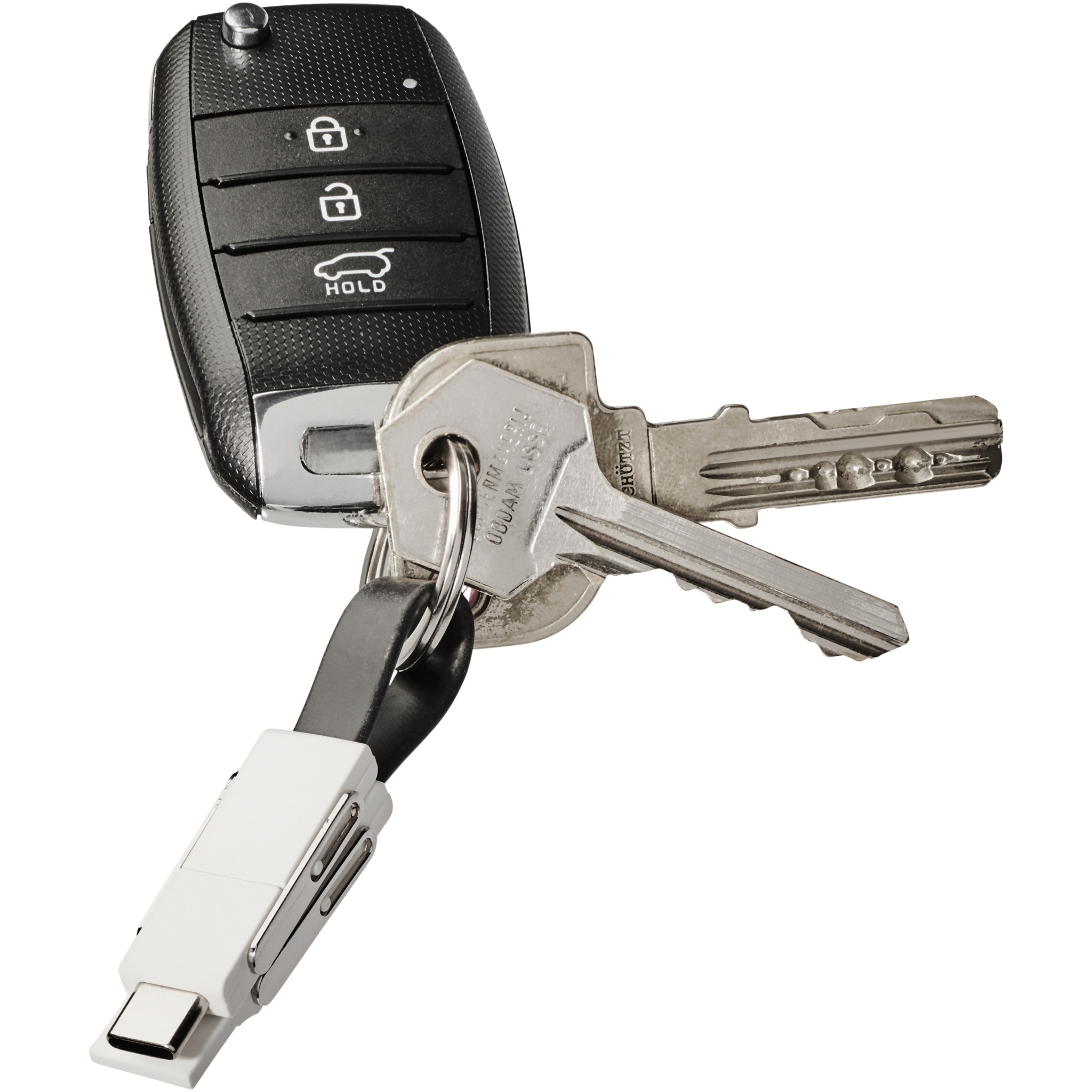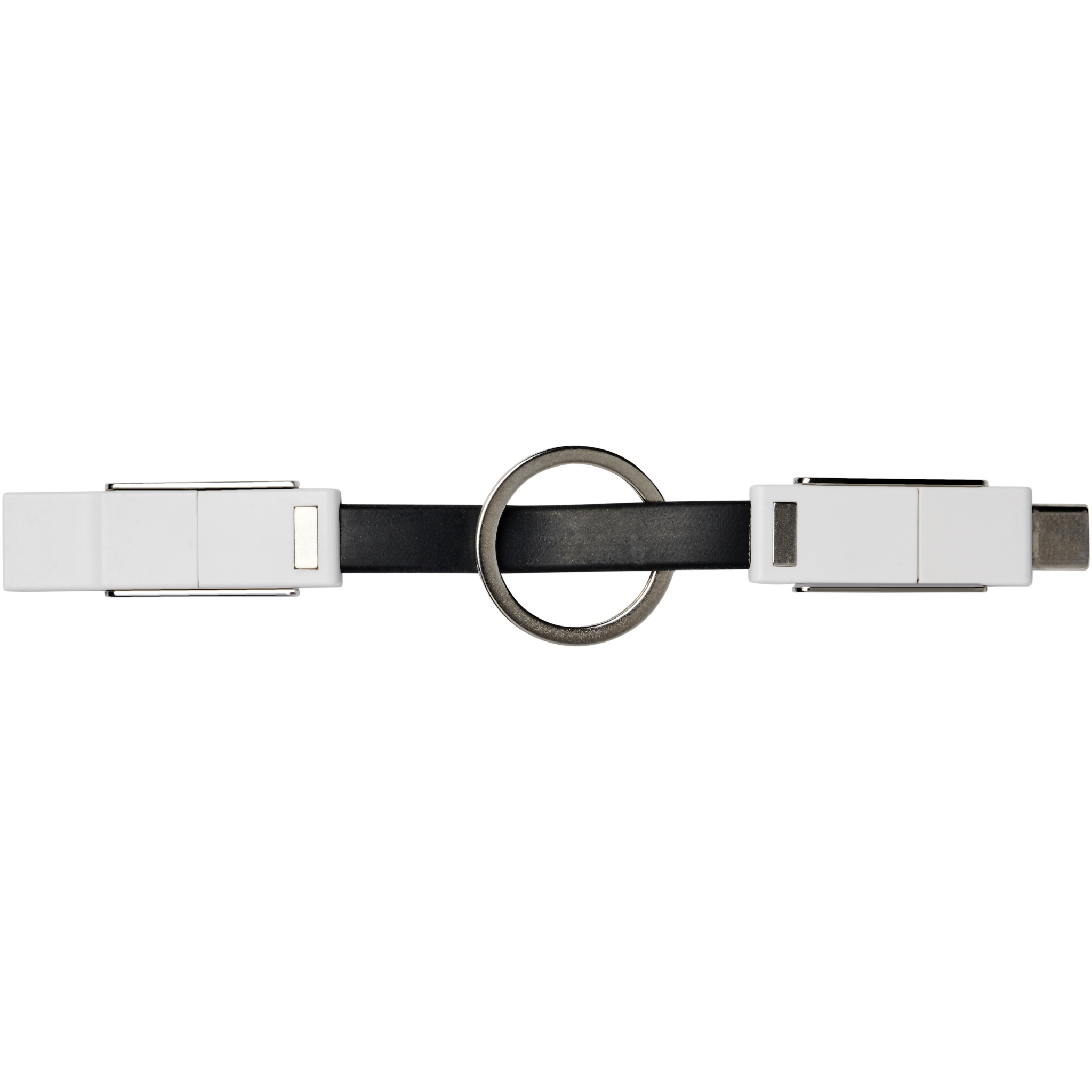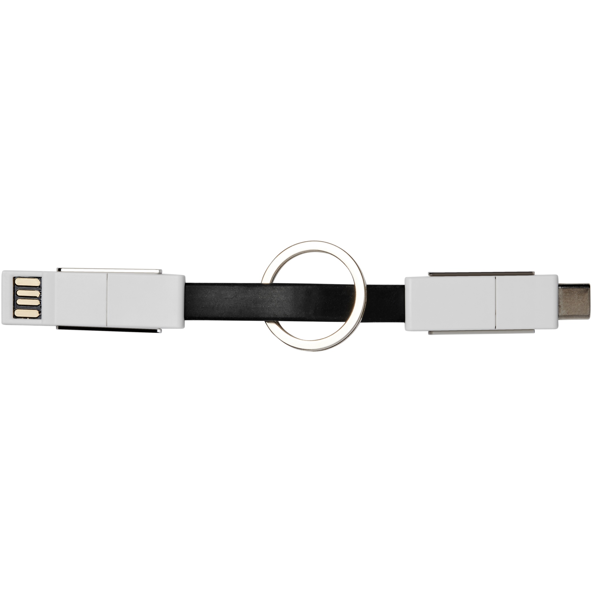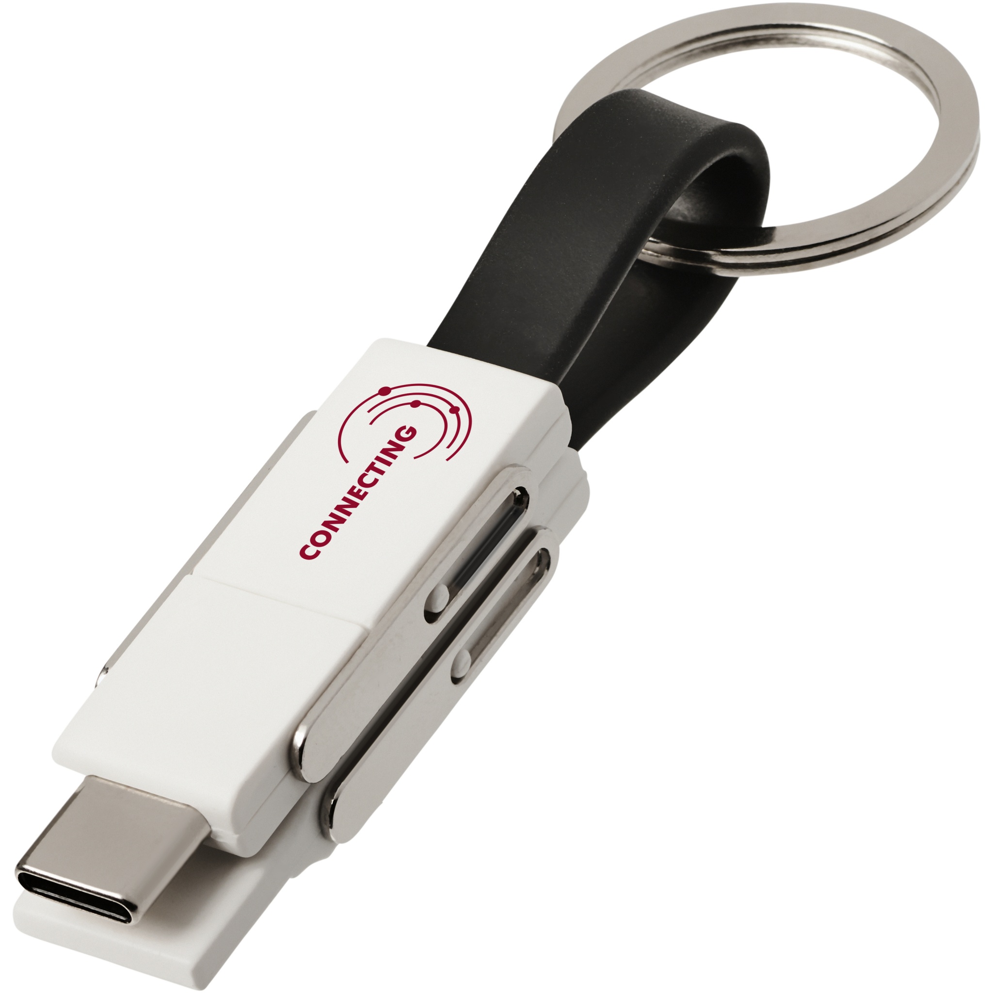 A 4-in-1 cable that covers all charging needs in one package. It features a USB type A, Type-C, and a 2-in-1 tip that is compatible with both iOS and Android devices. It can be used for charging and data transfer. Comes with a keychain and has magnets for convenient carrying.