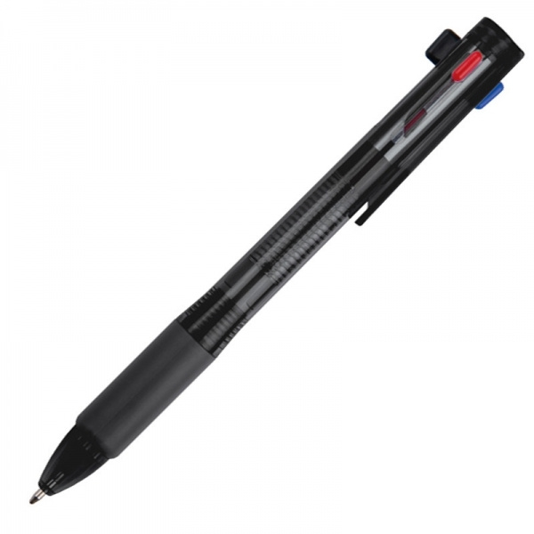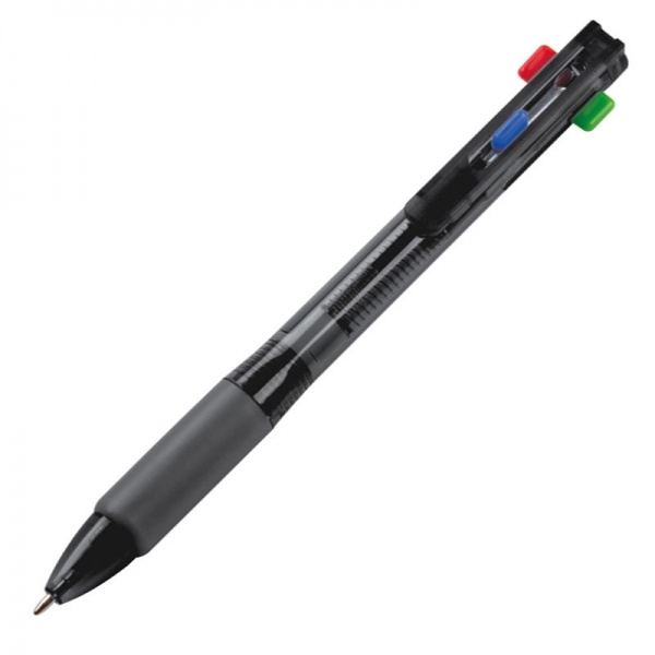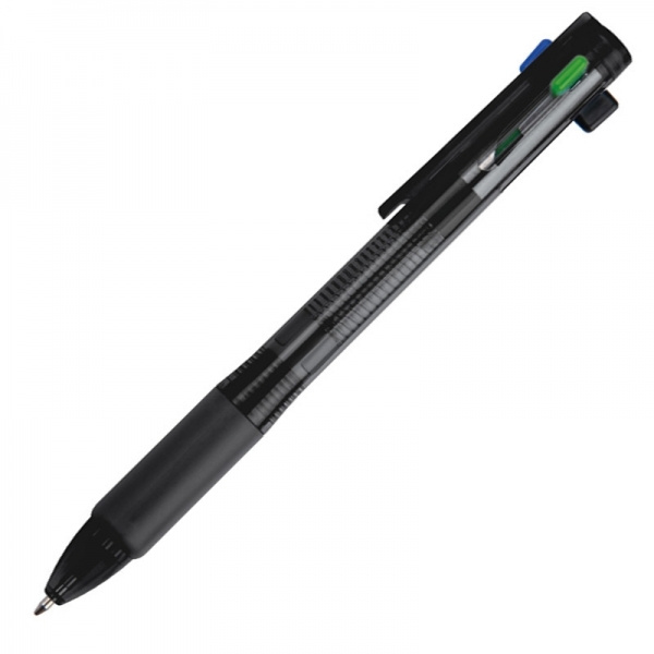 Plastic ballpen with 4 colored writing mines (blue, black, red, and green.) Your logo will be printed below the clip.
