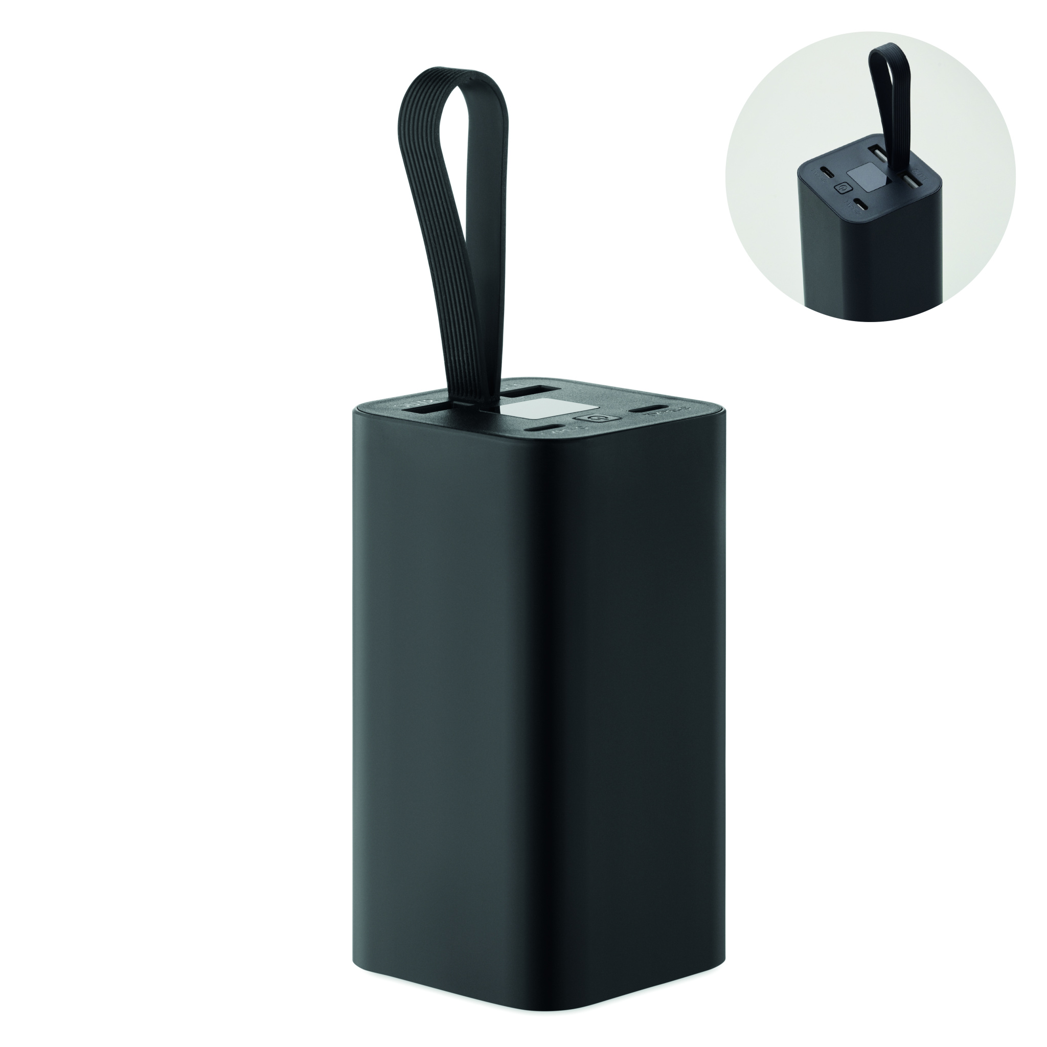 20.000 mAh power bank made of recycled aluminium with a digital power display and silicone hanger. Features two Type-C and two USB-A outputs with PD 65W fast charging.