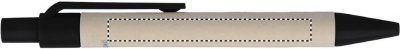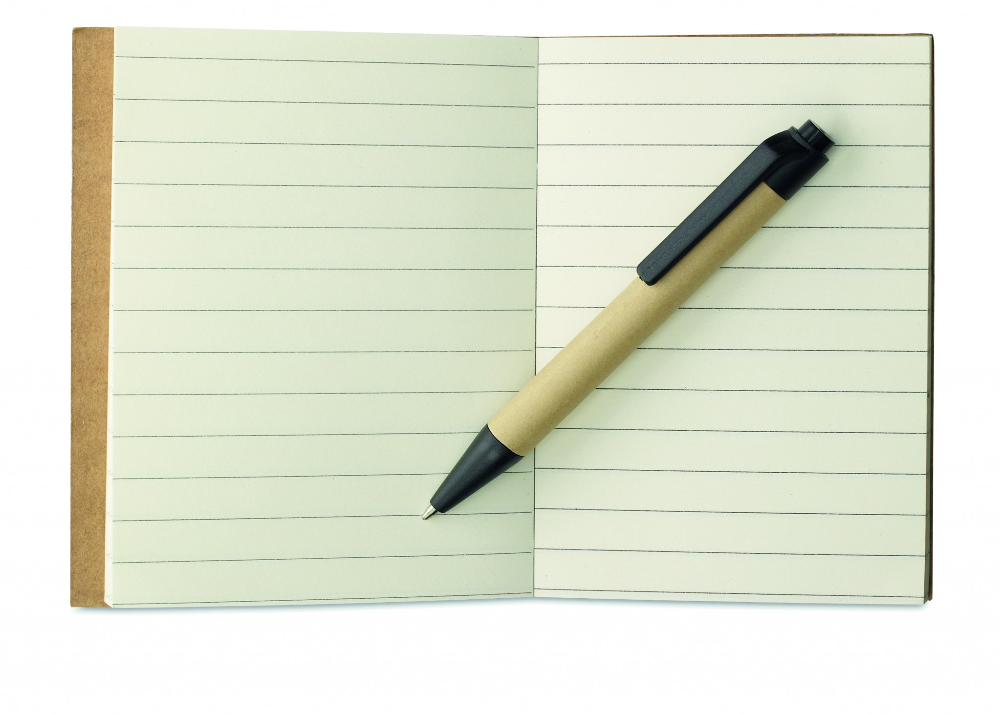 Recycled paper notebook with matching pen. Soft paper cover with pen holder. Casebound. 160 lined pages (80 sheets). Matching push button ball pen in recycled carton and biodegradable plastic. Blue ink.