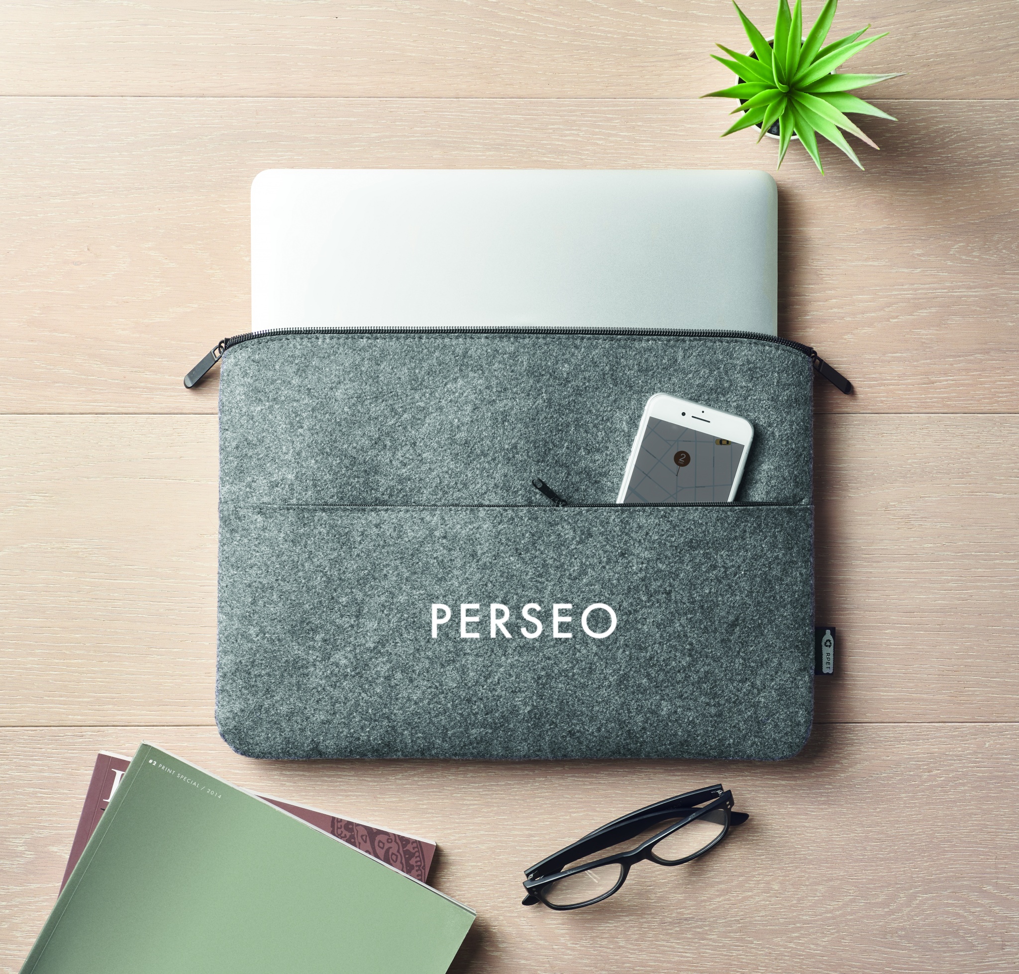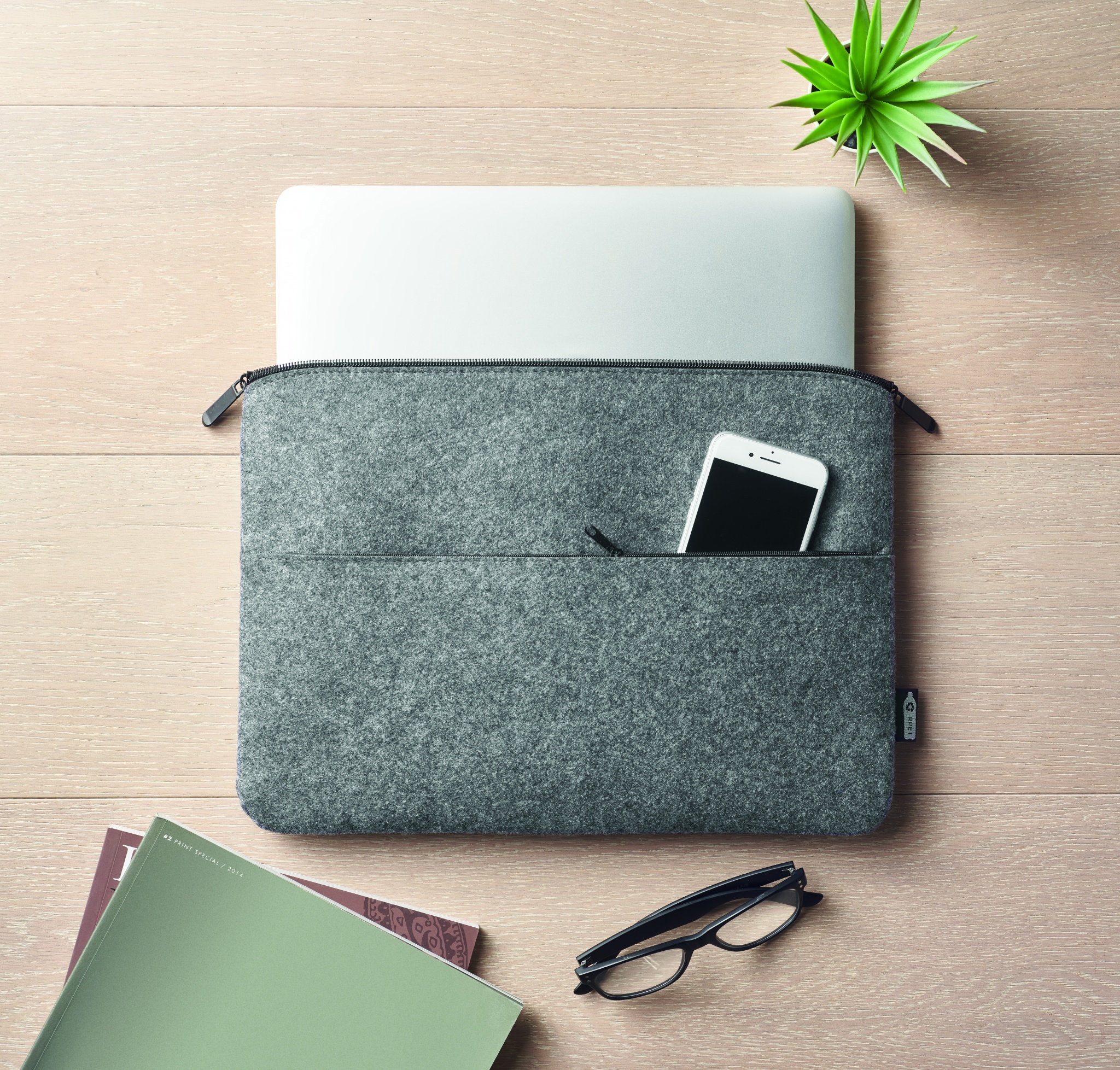 RPET felt 14 inch zippered laptop bag with zippered front pocket.