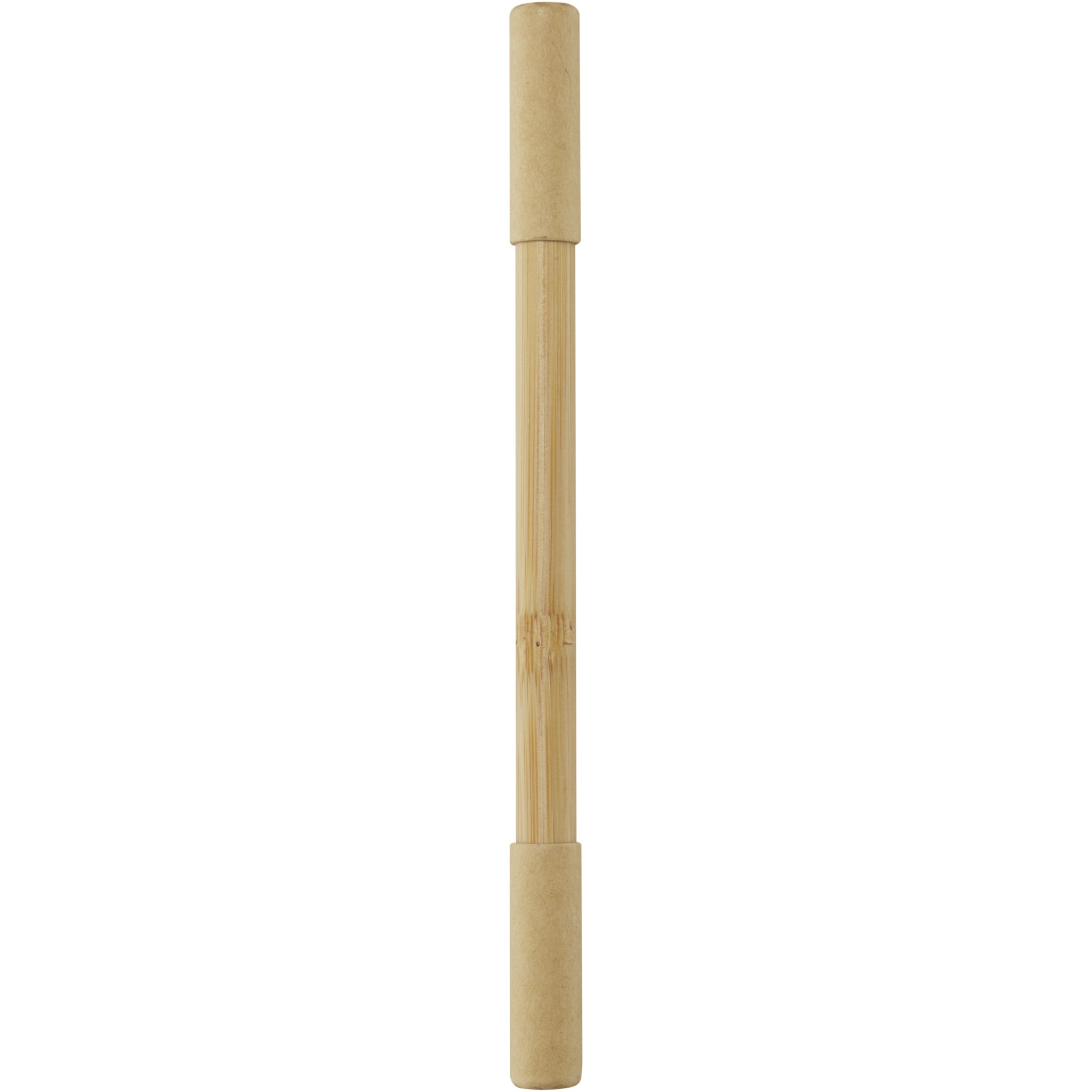 The Samambu bamboo duo pen has two heads: 1 ballpoint pen and 1 inkless pen. The inkless side does not require ink cartridges or refill. The pen's black graphite tip is designed to leave visible traces as it makes contact with the writing surface. Choosing a pen made of bamboo promotes making more sustainable choices, and encourages the use of renewable materials. The ballpoint pen has blue ink, a nib size of 1.00 mm, and a writing length of 600 metres. Writing length inkless pen: 1500 metres.