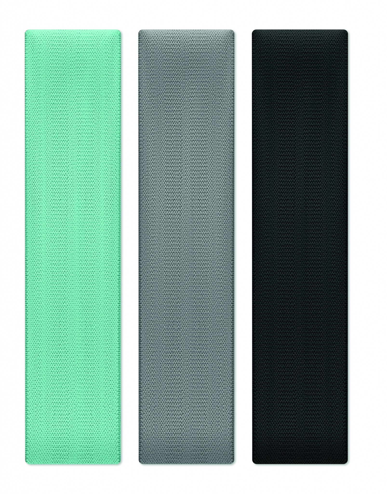 Set of 3 fitness bands in terylene, cotton and latex silk in an RPET pouch. Fitness bands all have a different strength for optimal training.