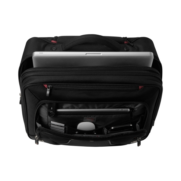 Perfect for the on-the-go commuter, this expandable rolling business case allows you to carry a laptop, tablet, documents and more with ease, Padded compartments protect up to a 16` / 41 cm laptop and an iPad, 10` / 25 cm tablet or eReader, Expands 2” / 5 cm when additional storage space is needed, Essentials organizer, Quik Pocket provides easy access to essentials, File divider separates and stores documents, folders and more, Pass-Thru trolley strap slides over the handle of wheeled luggage for easy travel, Comfort-grip telescoping trolley handle, Easy-glide wheels