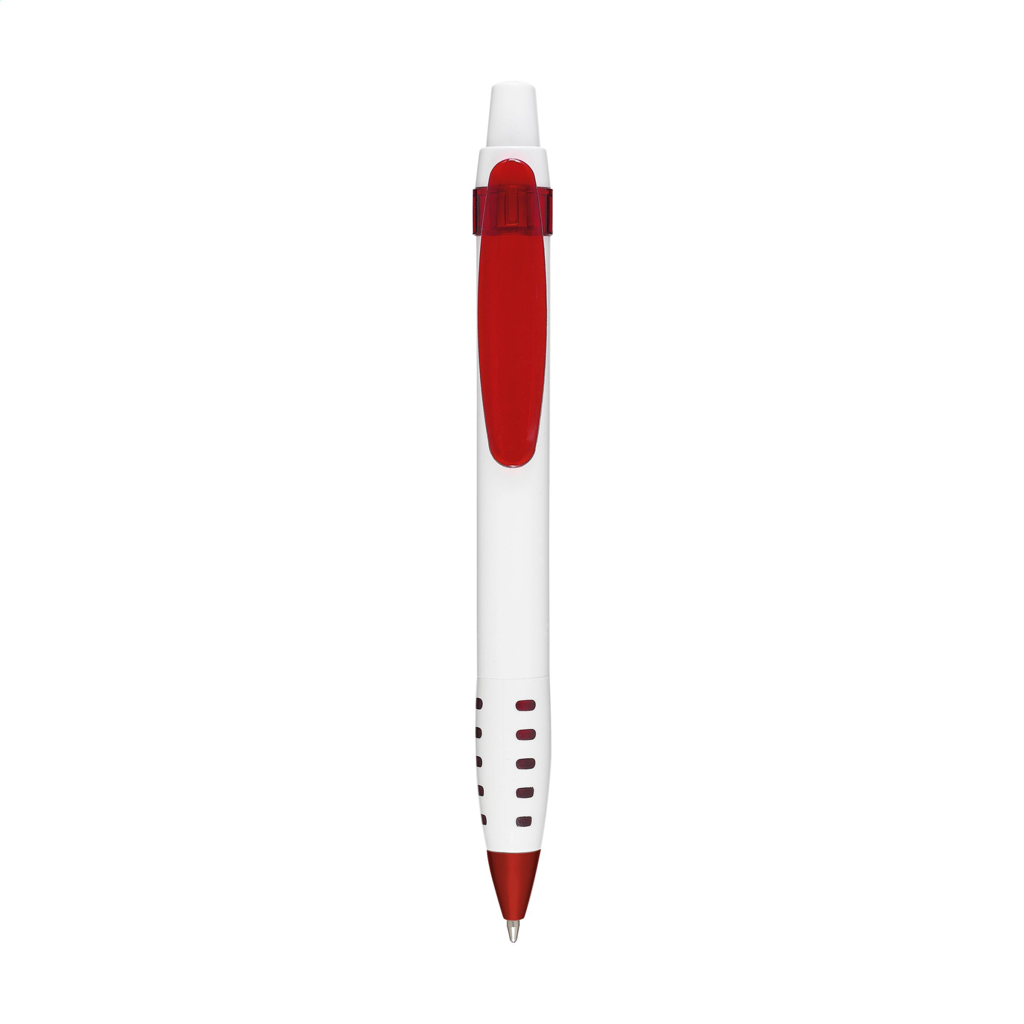 Blue ink ballpoint pen with transparent coloured clip and matching indented detail on the neck.