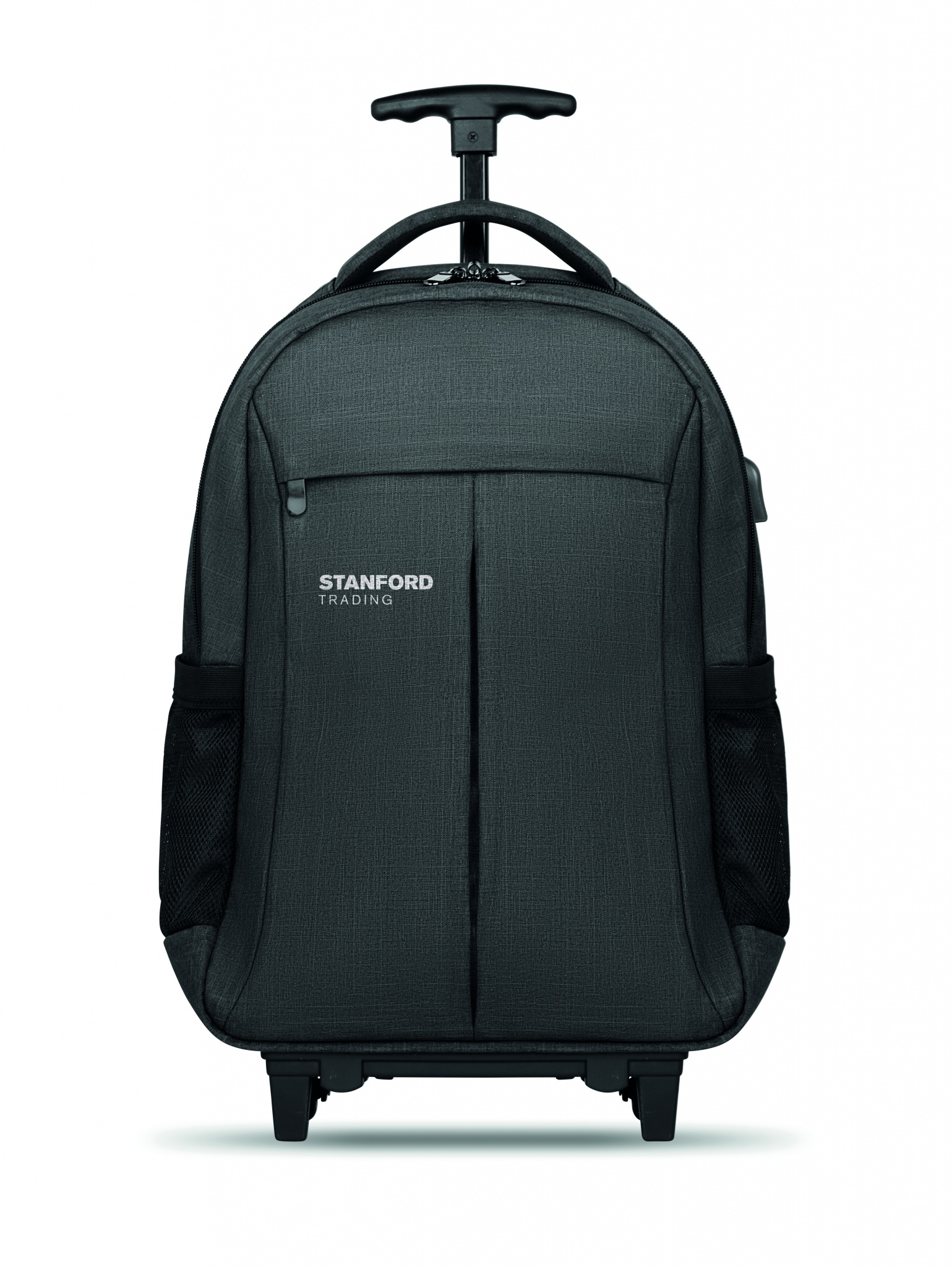 Backpack trolley in 360D 2 tone polyester. Includes one internal 15 inch laptop compartment and one main front part with zipper pocket. Padded back and shoulder straps. Includes Tablet compartment. Has an integrated sleeve for protecting the wheels when carrying.