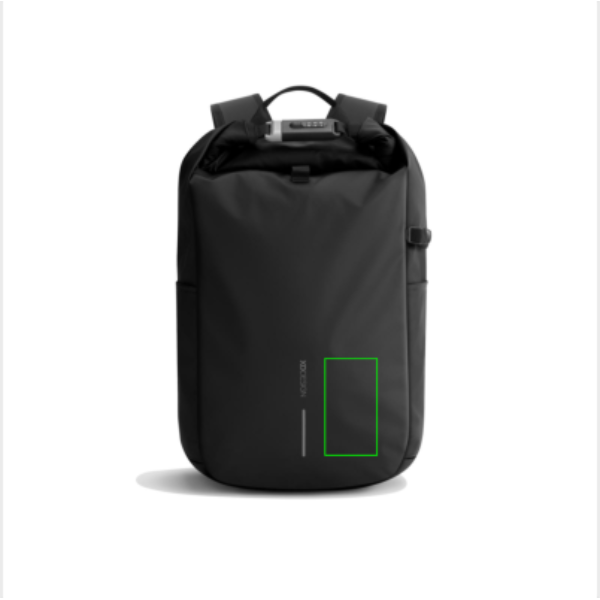The new Urban anti-theft backpack stands as the ideal travel companion, ensuring security and convenience. By rolling up the main compartment and securing it with the reinforced combination lock, the backpack offers complete closure, which can also be used to lock the bag around a fixed object. Hidden pockets on the back. The bag is equipped with a side water bottle pocket. Internally, padded compartments cater to a 16” laptop and mesh pockets provide organisation for your essentials. Crafted with Aware™ traceable recycled polyester and finished with a soft touch water resistant PU coating. 11% recycled content. Registered design®
