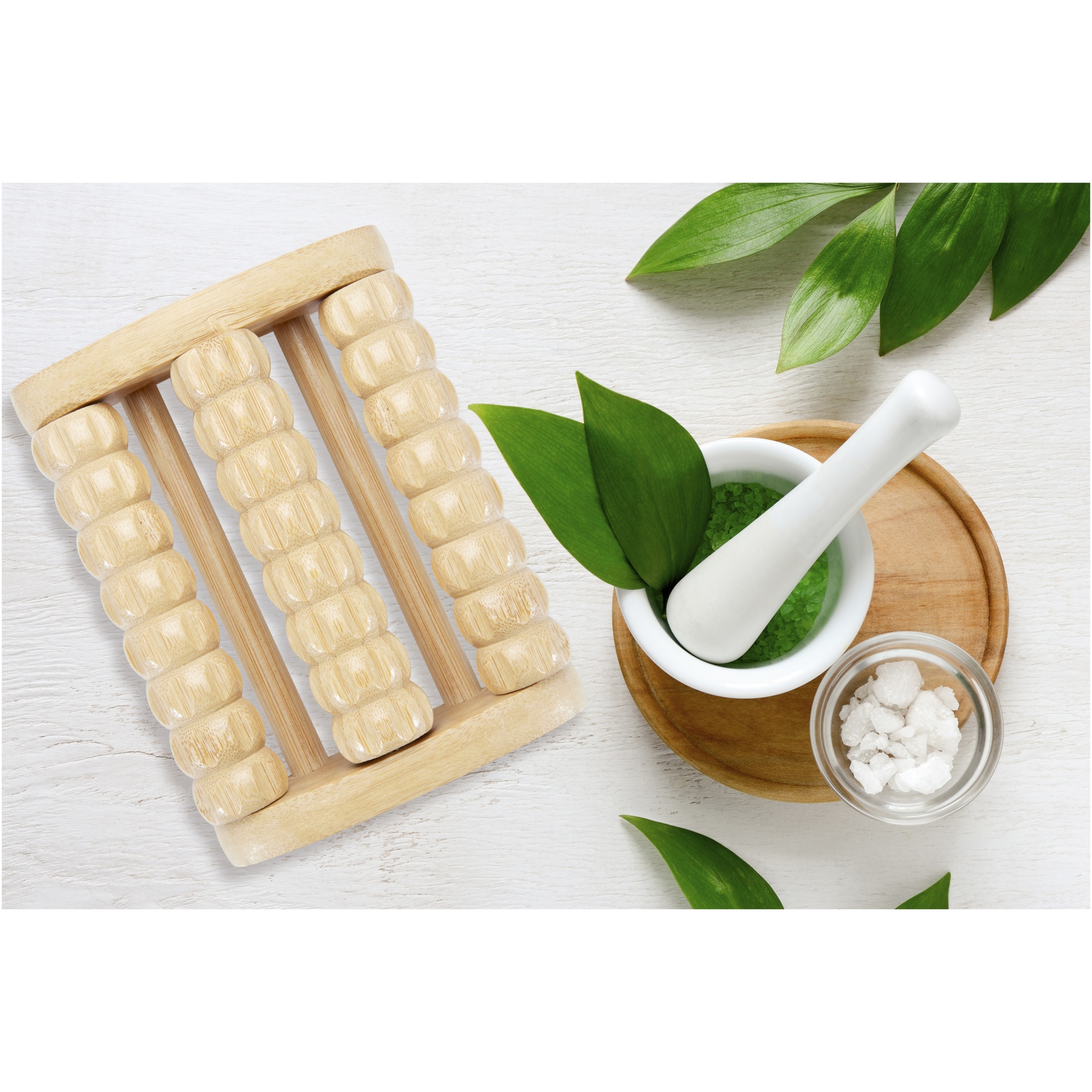 Foot massage roller made of bamboo featuring 3 rows of massage rods. Simply place the massager on the floor and then move your feet over for a nice relaxing feeling. The bamboo used is sourced and produced following sustainable standards.