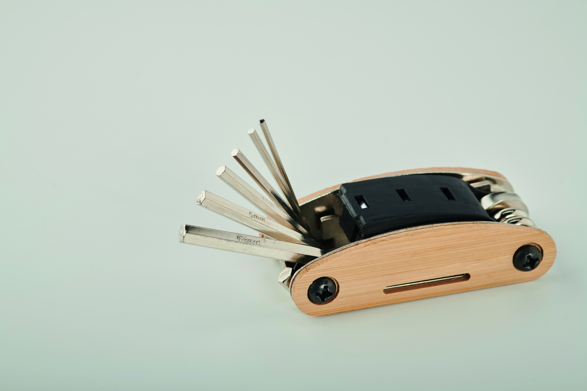 Roostevabast terasest mitmeotstarbeline bambuskattega taskutööriist. 11 funktsiooni. See sisaldab: kuuskantvõtmeid, lamevõtit, varrukapikendust, Phillipsi kruvikeerajat ja mutrivõtit.