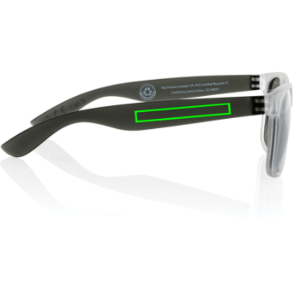 Päikeseprillid on valmistatud RCS-sertifikaadiga taaskasutatud läbipaistvast arvutiraamist. Värviliste peegelklaasidega. Taaskasutatud kogusisaldus: 72% eseme kogukaalust. RCS-sertifikaat tagab taaskasutatud materjalide täielikult sertifitseeritud tarneahela. Objektiivid vastavad standarditele EN ISO 12312-1, UV 400 ja CAT 3. Pakitud FSC® kraftkarpi.