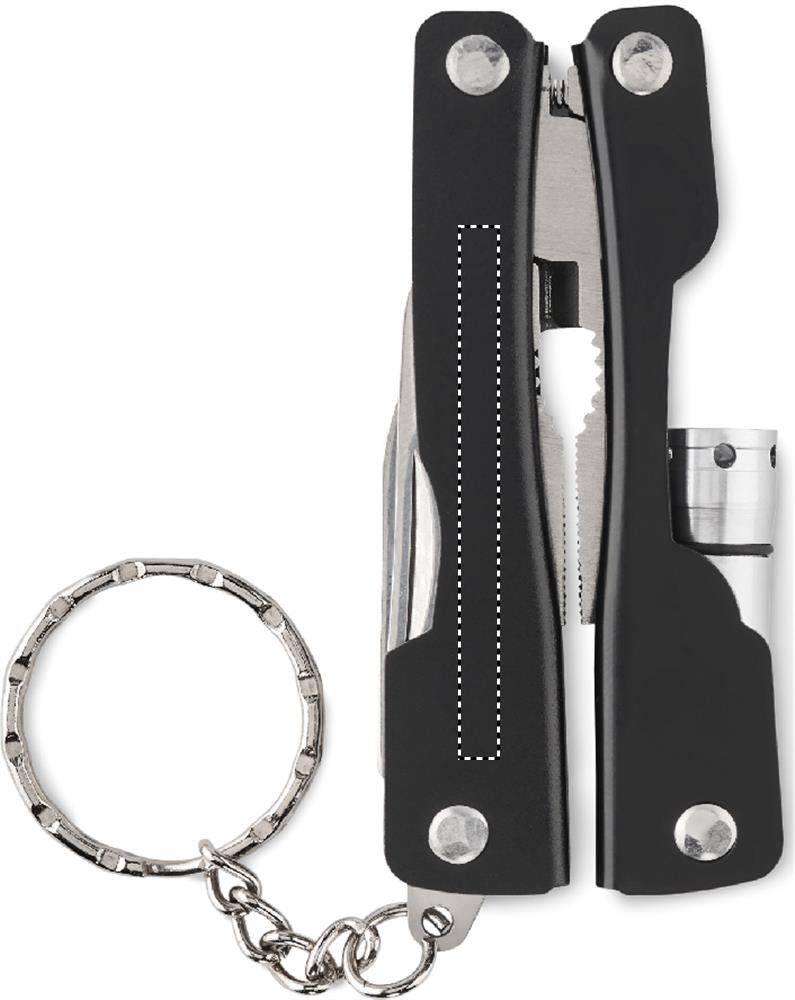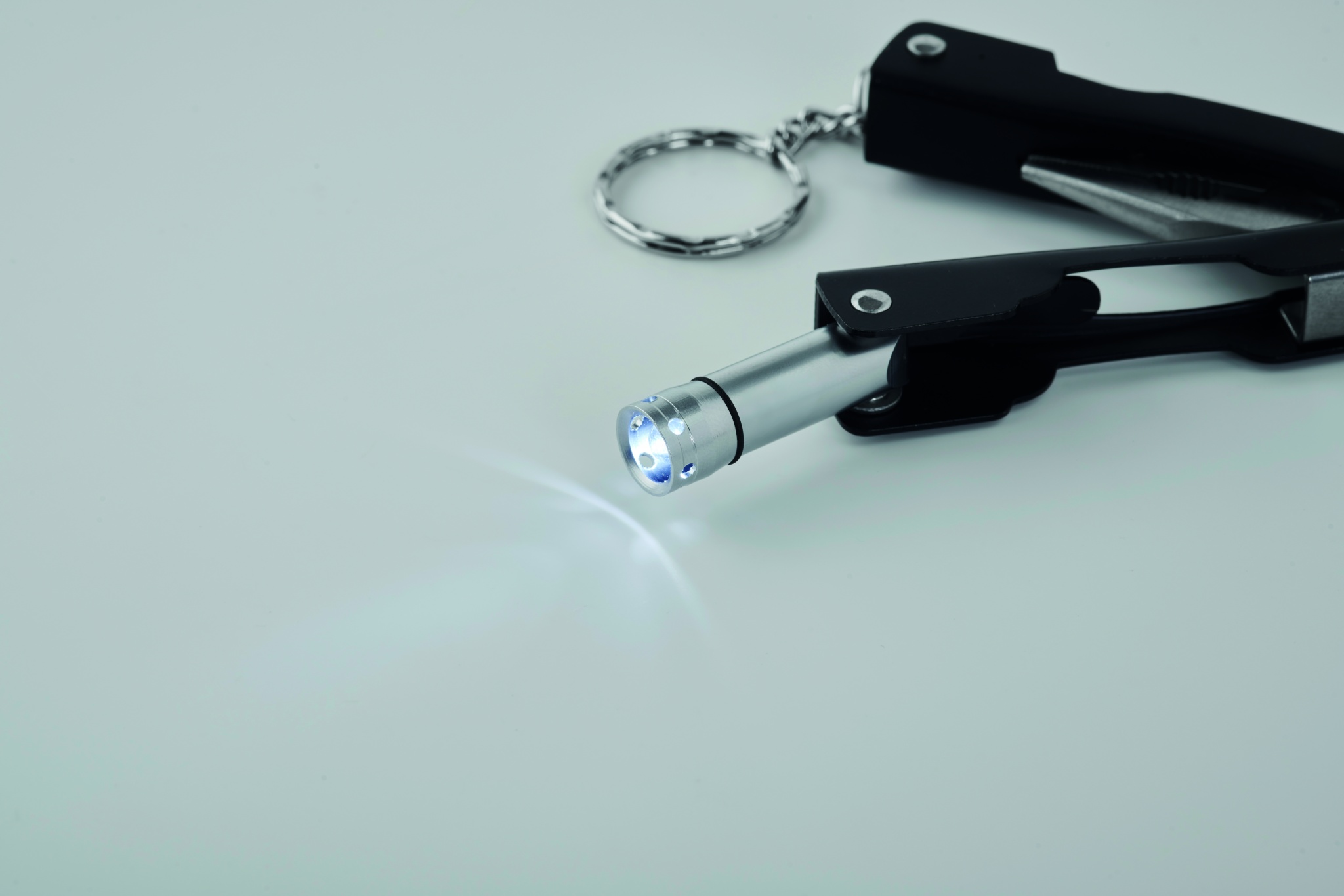 Kokkupandav mitme tööriistaga nuga taskulambiga roostevabast terasest. Sisaldab 10 tööriistafunktsiooni, sealhulgas 600D polüesterkott. Sisaldab 3 x AG3 nööpelemente.