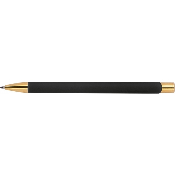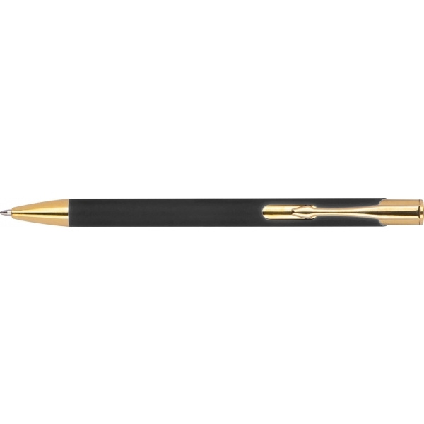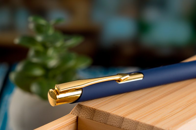 Alumiiniumist pastapliiats, millel on kuldsed aplikatsioonid, kummiviimistlus ja sinise kirjaga suure mahutavusega täidis. Teie logo lastakse klipi paremale küljele, see kuvatakse kuldse värviga.