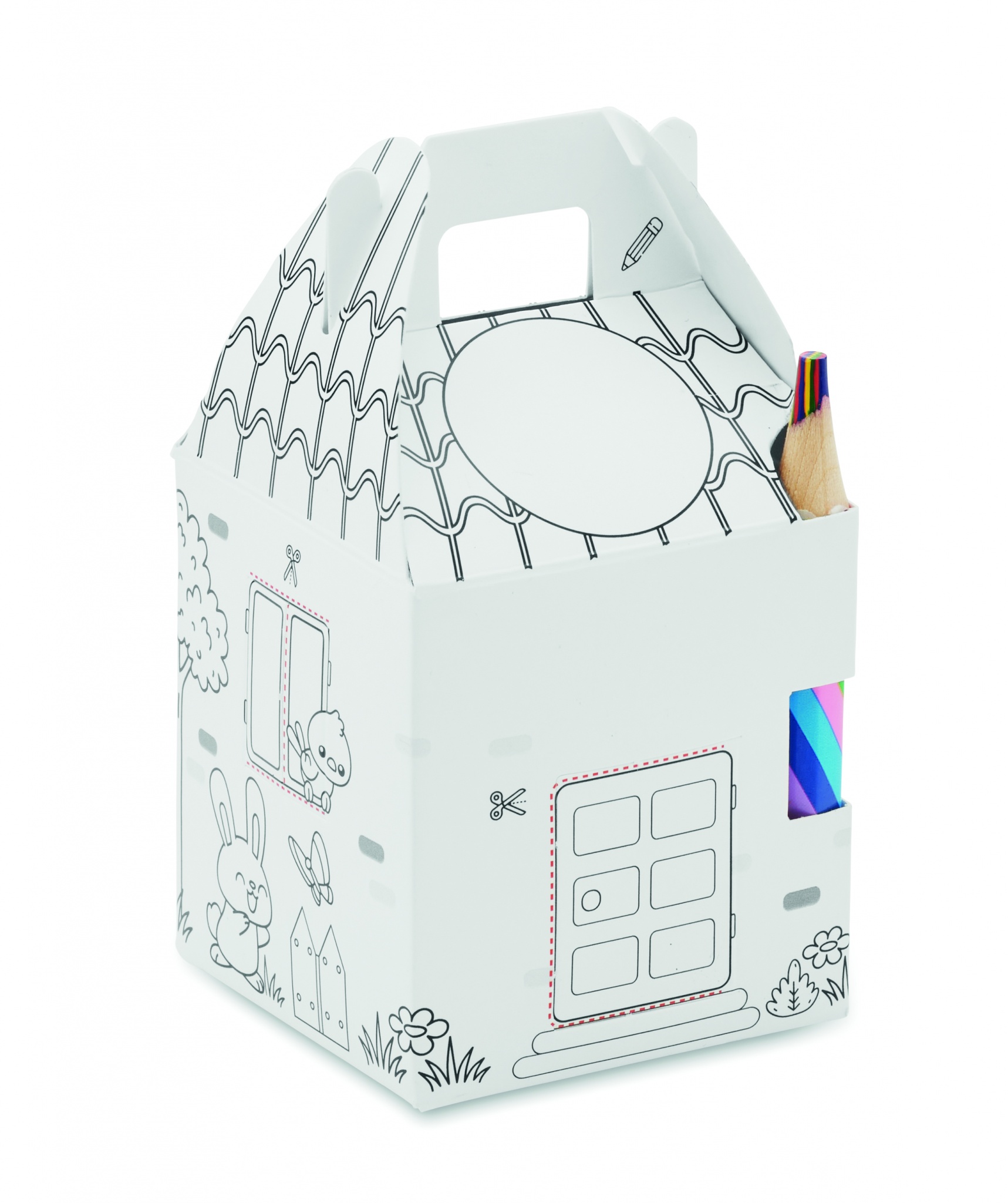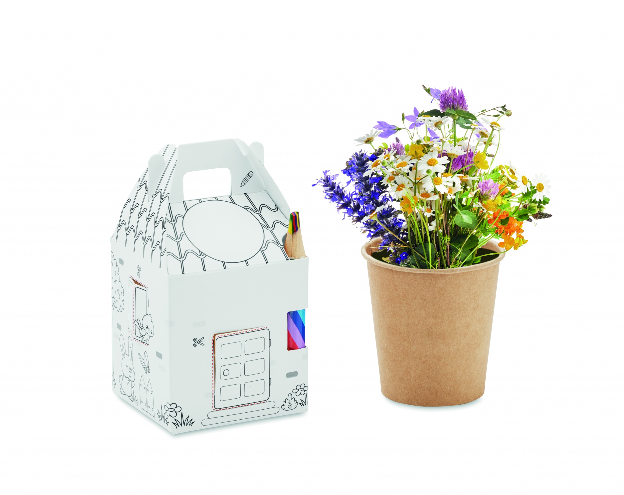 Kasvumaja komplekt lastele. Sisaldab mesililleseemneid ja mitmevärvilist puidust pliiatsit.