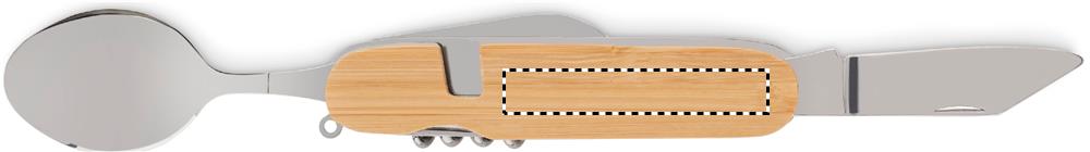 Metallist mitmeotstarbeline kokkupandav matkasöögiriistade komplekt puidust korpuses. 5 funktsiooni. Kaasas kahvel, lusikas, konserviavaja, veiniavaja ja nuga. Saate tükid eraldada kaheks.
