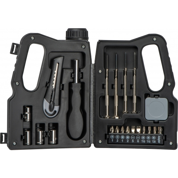 Kanistri kujuga tööriistakomplekt. Kanistris on kõik vajalik väiksemateks töödeks. Komplektis on lõikur, 1-meetrine mõõdulint, neli kruvikeerajat, käepide erinevate otsikute jaoks ja üheksa erinevat otsikut koos adapteriga.