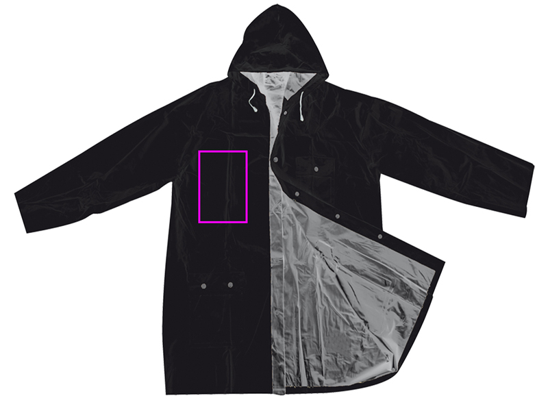 Pööratav PVC vihmajope kapuutsiga, kahe tasku ja trukkidega. Mantli seljaosa - 103 x 60 cm.