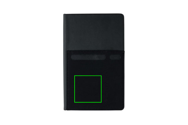 A5 muistikirja, jossa on 160 kermanväristä viivoitettua sivua 80g/m2. Etukannessa on joustava puhelin- tai kynätasku ja suurempi kotelo asiakirjoille. Puhelintasku on 8cm leveä, joka sopii iPhone 7 plus puhelimille.