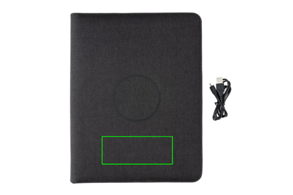 Tämä A4 portfolio, jossa on 20 kermanväristä viivoitettua 70 gramman paperiarkkia muistiona, edustaa uusinta tekniikkaa. Etukannessa on langaton latausalusta puhelintasi varten. (Androidin uusimmat sukupolvet, iPhone 8 ja uudemmat.) Vanhemmat puhelimet ja tabletit voidaan ladata USB-liitäntöjen kautta 5 000 mAh varavirtalähteen avulla. Sisääntulo: 5,0 V/2,1 A. Ulostulo 1: 5,0 V/2,1 A. Ulostulo 2: 5,0 V/2,1 A. Langaton ulostulo: 5W. Rekisteröity malli®