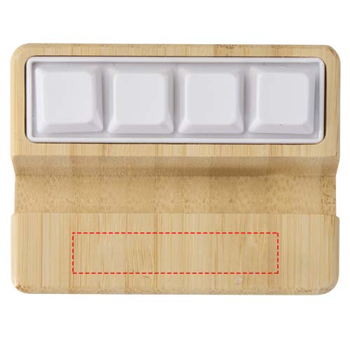 Logo trade mainostuote kuva: Algol kierrätetystä muovista valmistettu puhelinjalusta ja hypistelylelu bambuyksityiskohdilla