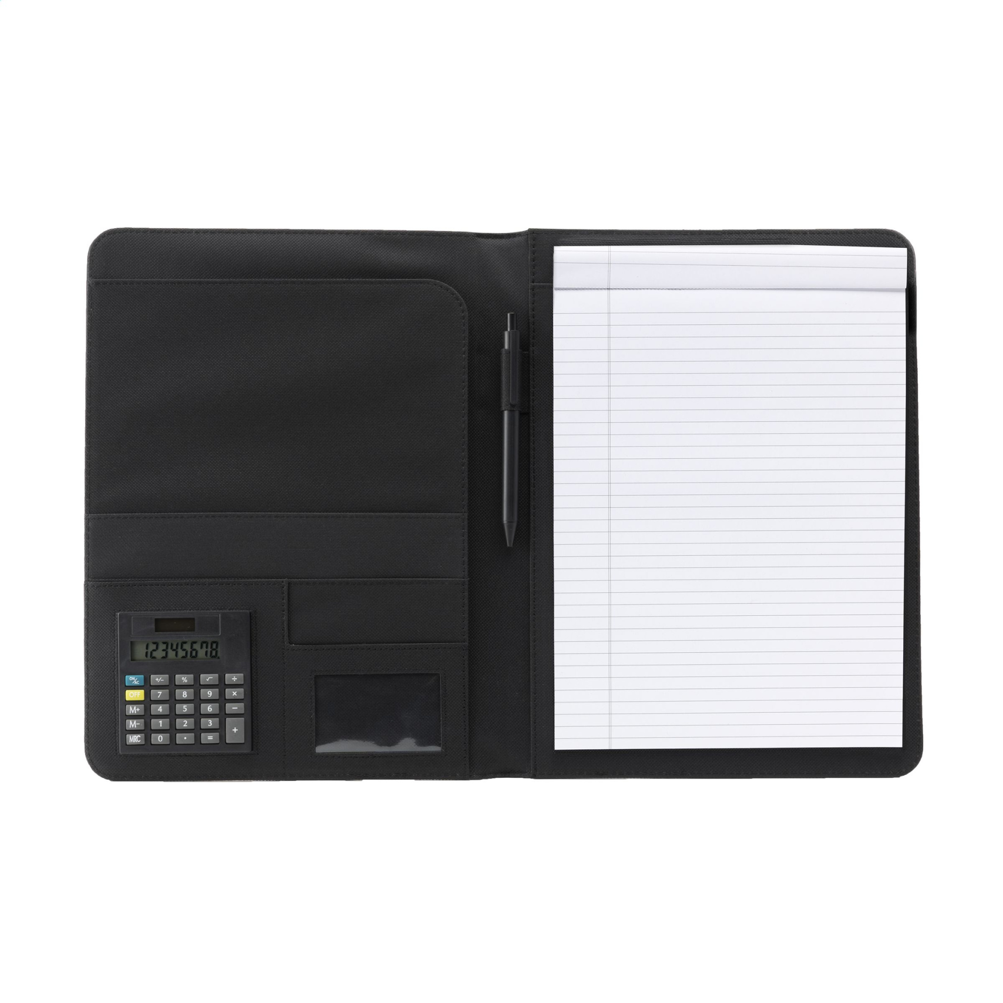 Neuvottelu-/asiakirjakansio 600D polyesteri/keinonahasta A4-muodossa. Sisältää irrotettava kaksoisteholaskin (sisältää pariston) kirjoitusalusta ja kuulakärkikynä..