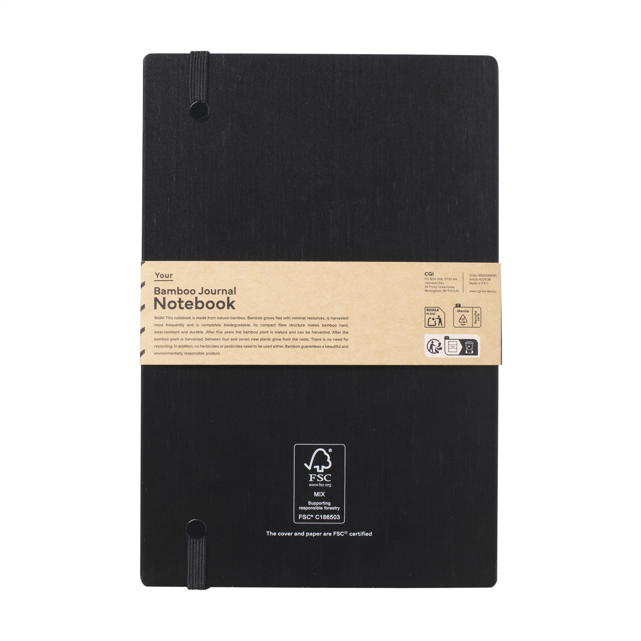 A5-kokoinen muistivihko tukevalla, mustaksi lakatulla FSC 100 % sertifioidulla bambukovakansiisella. Paljas selkäsidos. Tämä ominaisuus on suunniteltu erityisesti avaamaan kannettava tietokone mahdollisimman tasaisesti. Tämä tekee muistiinpanojen ja luonnosten tekemisestä paljon helpompaa. Joustava suljin ja n. 96 arkkia/192 sivua valkoista, vuorattua, FSC Mix -sertifioitua paperia.
