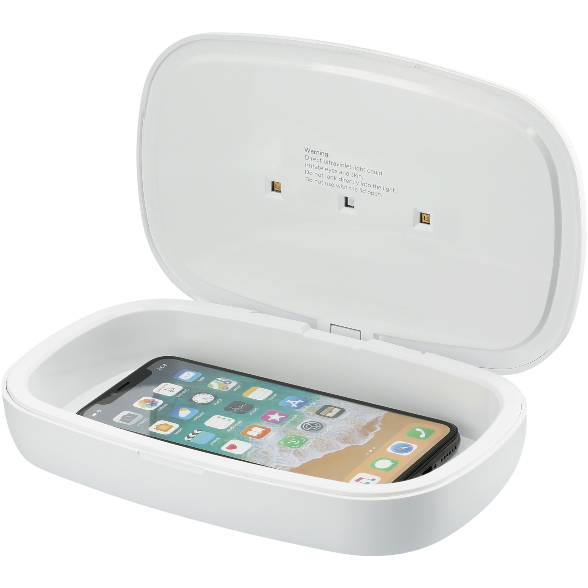Capsule Älypuhelimen UV-puhdistaja 5 W:n langattomalla latausalustalla. Tuotteella voi ladata ja puhdistaa älypuhelimen sisäänrakennettujen UV-C-LED-valojen avulla. Desinfiointitiloja on kaksi. Aloita lyhyt 90 sekunnin puhdistus painamalla painiketta kerran. Aloita viiden minuutin syväpuhdistus painamalla painiketta kaksi kertaa. Älypuhelinten lisäksi Capsule voi puhdistaa kaiken laatikkoon mahtuvan, kuten avaimet, nappikuulokkeet ja muut henkilökohtaiset tavarat. Testien perusteella se poistaa jopa 99,9 % bakteereista, kuten Escherichia coli, Staphylococcus ja Candida albican. Tuotetta ei voi käynnistää, kun kansi on auki, jotta käyttäjä ei altistu UV-valolle. Kun kotelo avataan desinfiointiprosessin aikana, laite estää silmien/ihon altistumisen pysähtymällä heti. Pakattu ensiluokkaiseen lahjapakkaukseen. Sisämitat: 181 x 104 x 26 mm.