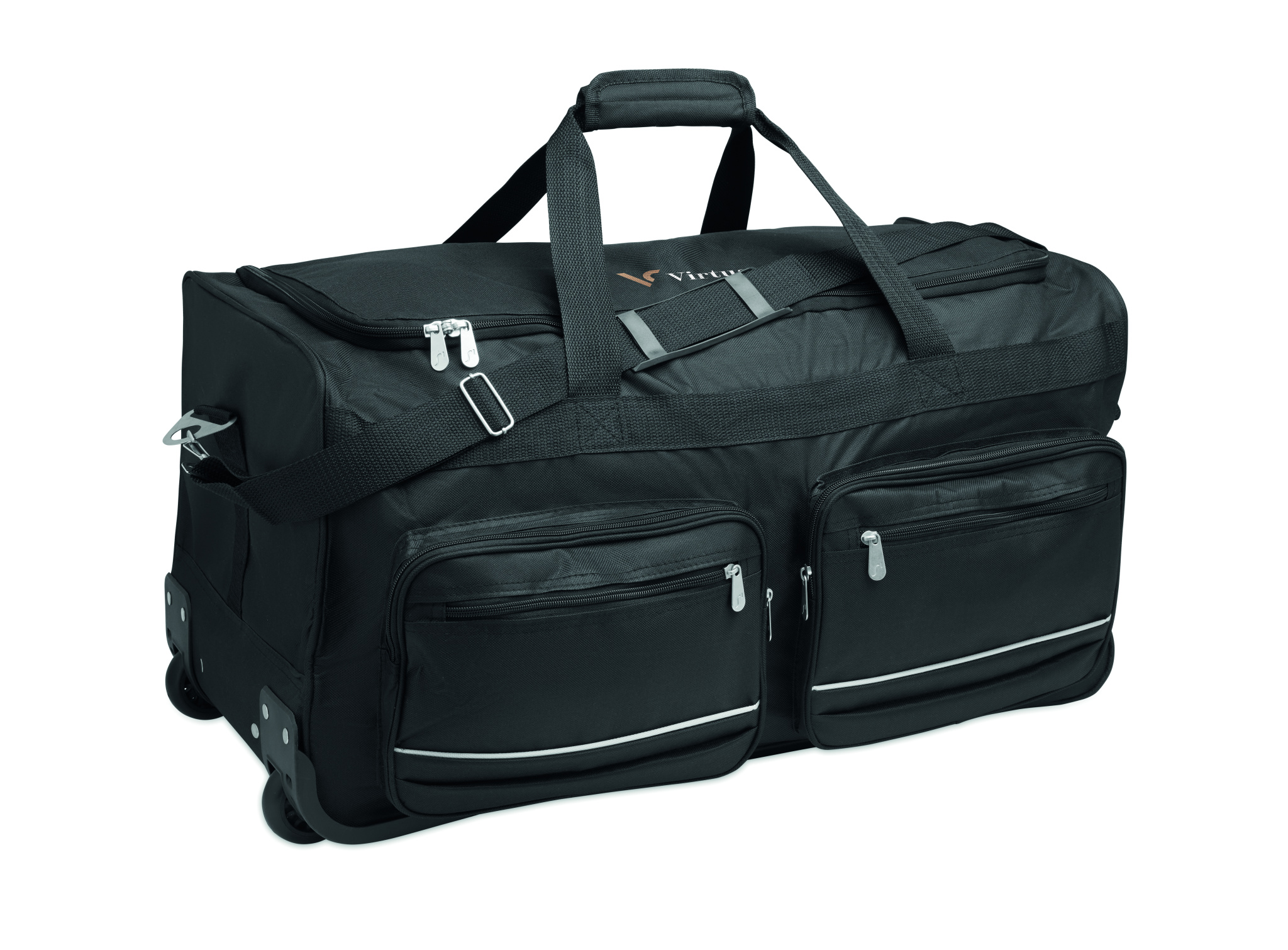Pehmeä duffeli vetolaukku 600D RPET -materiaalia. Vetoketjullinen etutasku. Kaksi sivutaskua. Kolme sisätaskua. Pehmustetut olkahihnat. Kaksi pyörää ja tuplaputkirunko.