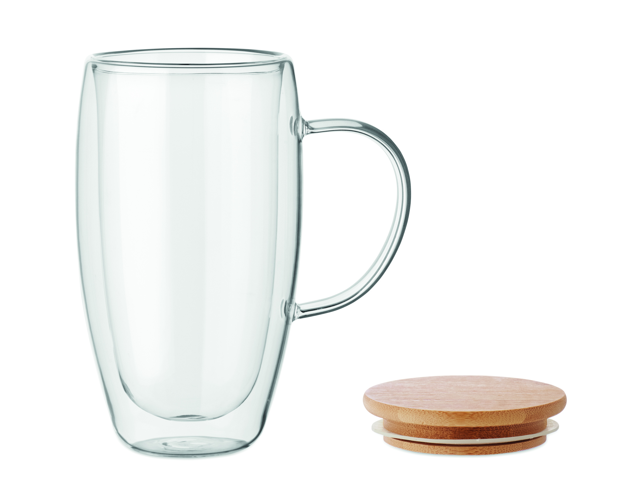 "Kaksiseinäinen borosilikaattilasimuki kahvalla ja bambukannella. Tilavuus: 450 ml."