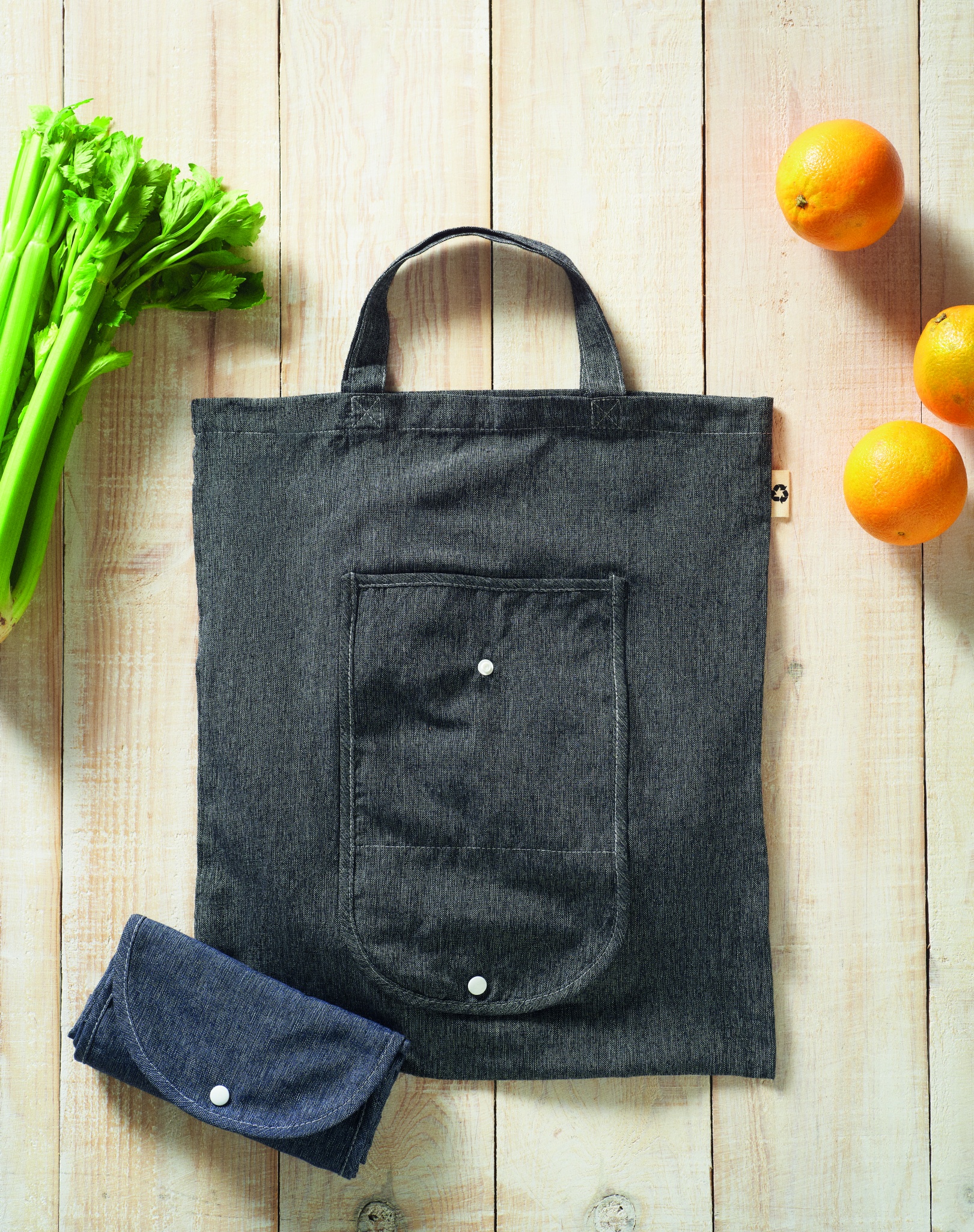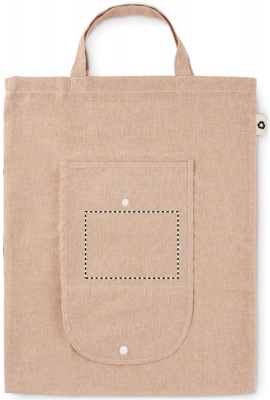 140 gr/m² kaksisävyinen kokoontaitettava kassi, valmistettu kierrätetystä puuvillasta ja polyesteristä (20%/80%). Tuota voi kutistua painossa, maksimi kanto painoraja 2,5 kiloa.