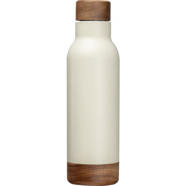Kierrätetystä ruostumattomasta teräksestä valmistettu kaksiseinäinen lämpöpullo, jossa akaasiapuukorkki ja pohja. Tilavuus 630 ml